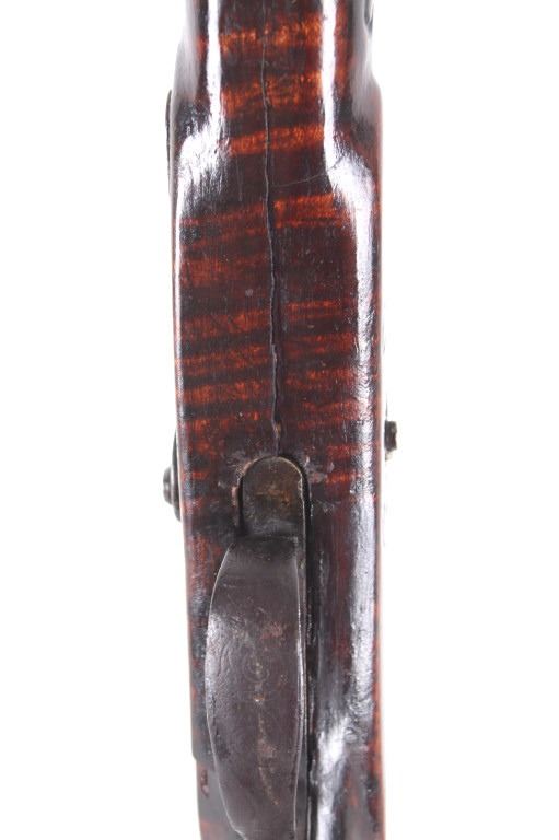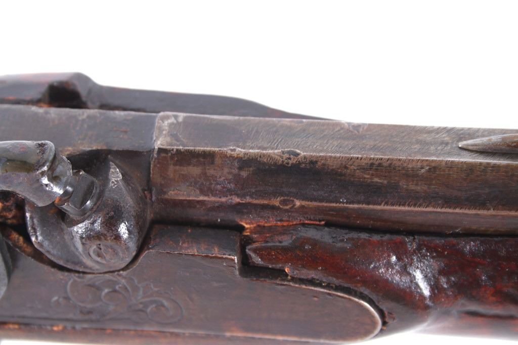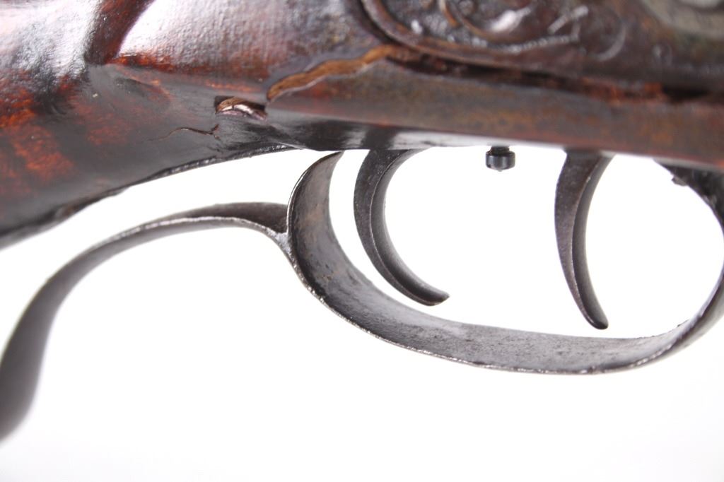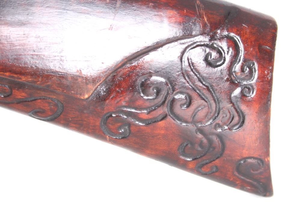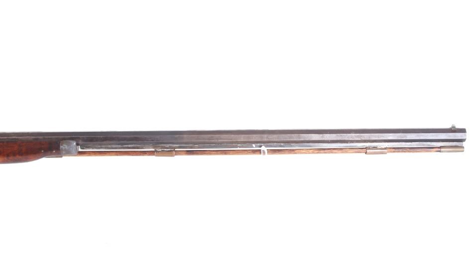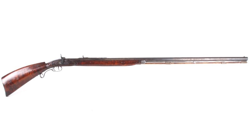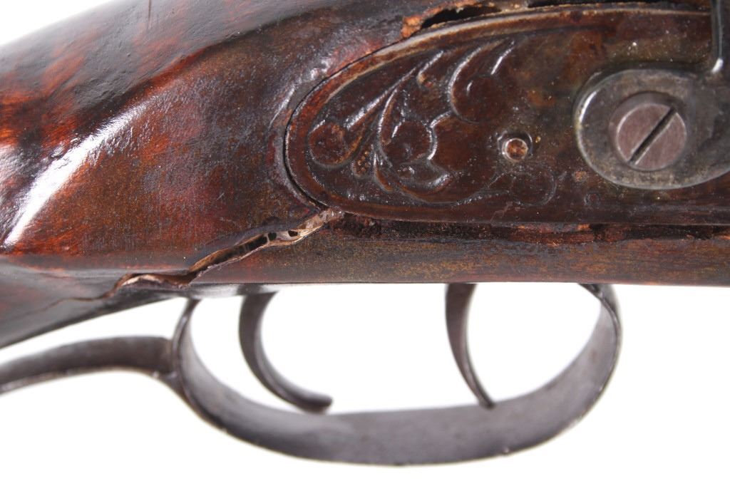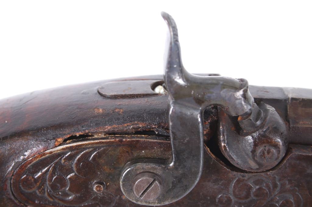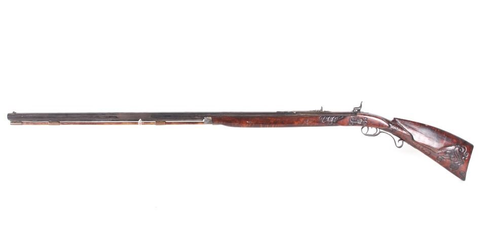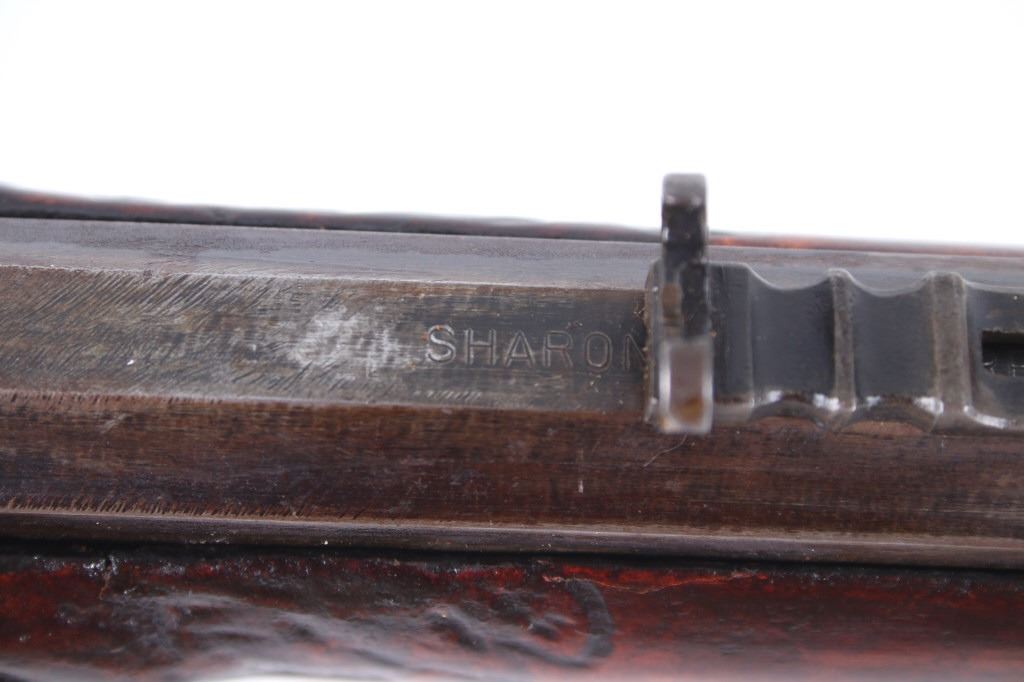 Featured in this lot we have a Sharon Barrel Co black powder percussion cap rifle chambered in .45 caliber. The rifle displays a 42" long octagonal barrel, maple half stock, steel trigger guard, dual trigger system, etched lock plate and hammer system, and blue'd finish. The barrel is marked across the top reading "SHARON BARREL CO". The lock plate displays etched floral designs in the front and back of the plate. The stock shows carved vine designs with a half length stock along the barrel. Mechanically the rifle displays a working dual trigger system and tight hammer action. The rifle shows a brass blade front sight and adjustable rear sight. The rifle shows fair condition overall with some wear due to age and damage to the stock around the lock plate and trigger guard. No Serial Number. This firearm qualifies as an Antique, and does not require FFL Transfer or NICS Background Check.