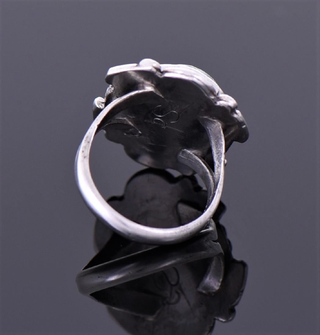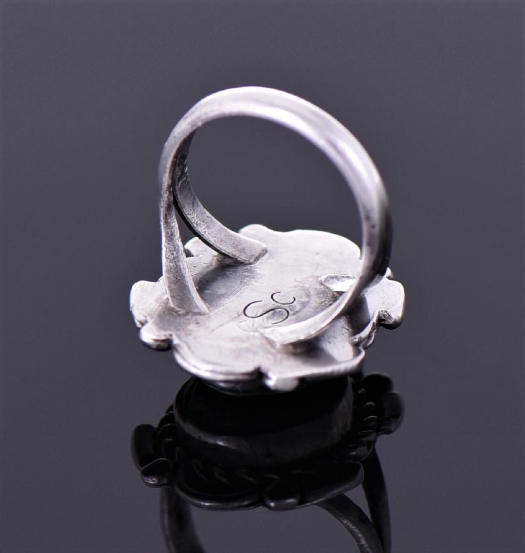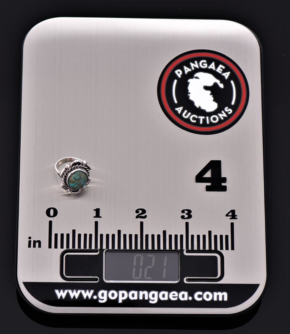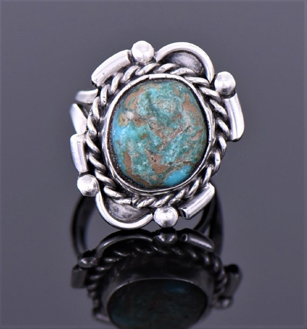 Sharon Cisco, Navajo Native American Southwest Blue Turquoise Nugget Sterling Silver Ring With Silversmith Rope Work And Ball And Rod Design. Ring Size Shown On Last Photo. Silver Tested. Estimated more than 50 yrs old. The Navajos are a Native American people of the Southwestern United States. After the Cherokee, they are the second largest federally recognized tribe in the United States. Until contact with Pueblos and the Spanish, the Navajos were largely hunters and gatherers. The tribe adopted crop farming techniques from the Pueblo peoples. The practice of spinning and weaving wool into blankets and clothing became common and eventually developed into a form of highly valued artistic expression. Silversmithing is an important art form among Navajos. Atsidi Sani c. 1830–c. 1918 is considered to be the first Navajo silversmith. He learned silversmithing from a Mexican man called Nakai Tsosi "Thin Mexican" around 1878 and began teaching other Navajos how to work with silver. By 1880, Navajo silversmiths were creating handmade jewelry including bracelets, tobacco flasks, necklaces and bracers. Later, they added silver earrings, buckles, bolos, hair ornaments, pins and squash blossom necklaces for tribal use, and to sell to tourists as a way to supplement their income. The Navajos' hallmark jewelry piece called the "squash blossom" necklace first appeared in the 1880s. Turquoise has been part of jewelry for centuries, but Navajo artists did not use inlay techniques to insert turquoise into silver designs until the late 19th century. (Wikipedia)Size And Weight: See Last Photo If Applicable. All Photos Represent The Lot Condition. Please Read Our Terms And Conditions.
