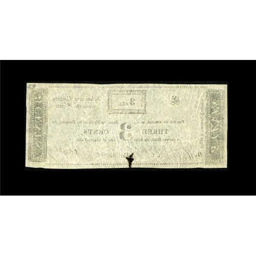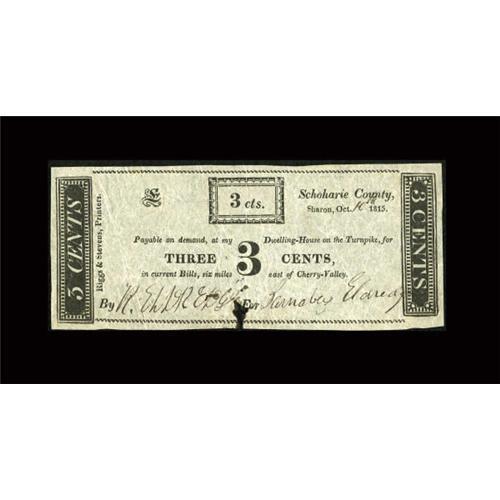 <B>Sharon, NY- B. Eldredge</B></I> 3¢ Oct. 10, 1815 Harris 4<BR> An extremely scarce early New York note, ex- Ford collection, May, 2005 sale, lot 4130. Well embossed and bright, but there is a small ink erosion hole at the bottom center. <B>Extremely Fine.</B></I><BR><I>From The Collection of a Louisiana Gentleman.</B></I><BR><BR><b>Shipping:</b> Coins & Currency (<a target="_blank" href="http://www.heritageauctions.com/common/shipping.php">view shipping information</a>)