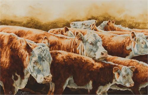 Sharon Rajnus (late 20th century). Herefords. 14 3/4" x 21 1/2" watercolor. Signed lower left. (est $800-1,200). Provenance: Coile Collection.