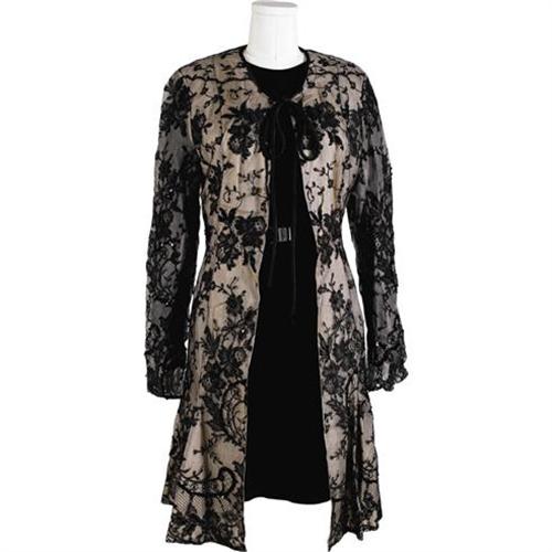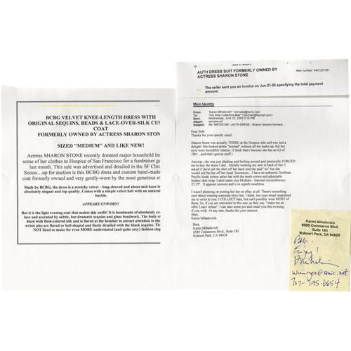 <B>Sharon Stone Owned Dress Suit.</B></I> A BCBG velvet knee-length dress with sequins, beads, and lace-over-silk custom coat, size Medium, owned by Sharon Stone. In Excellent condition. <I>Accompanied by a letter of authenticity.</B></I><I>From the Robert Johnson Memorabilia Collection.</B></I><BR><BR><b>Shipping:</b> Clothing, Costumes & Jerseys (<a target="_blank" href="http://www.heritageauctions.com/common/shipping.php">view shipping information</a>) <BR><BR><B>Important notice:<