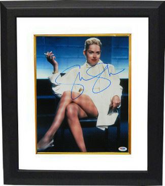 Sharon Stone first caught the public eye opposite Arnold Schwarzenegger in Total Recall . She then achieved international recognition for her starring role in the erotic thriller Basic Instinct (1992) by Paul Verhoeven. She was nominated for an Academy Award for Best Actress and won a Golden Globe Award for Best Actress in a Motion Picture Drama for her performance as Ginger McKenna in the crime drama film Casino (1995), directed by Martin Scorsese. Sharon Stone has hand signed this Basic Instinct 11x14 Photo Famous Leg Crossed with Cigarette. PSA Hologram and Certificate of Authenticity. Custom White Mat and Premium Black Color Framed as shown.