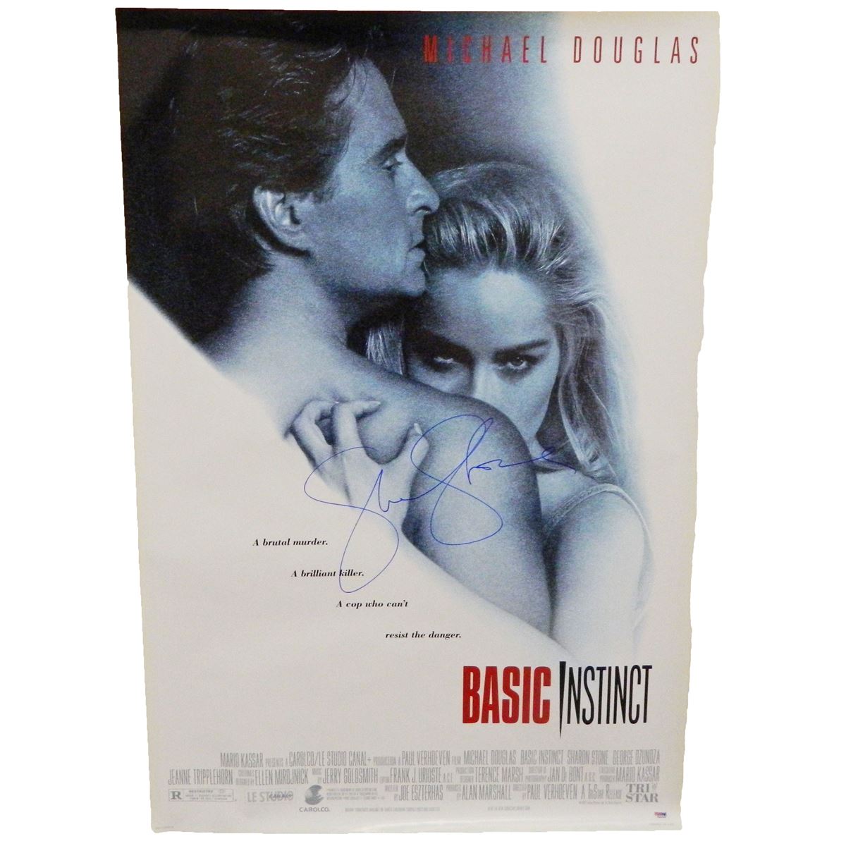 Sharon Stone signed Basic Instinct 27x40 full size movie poster. Item comes with a PSA/DNA tamper evident numbered sticker and matching Certificate of Authenticity which can be verified online.