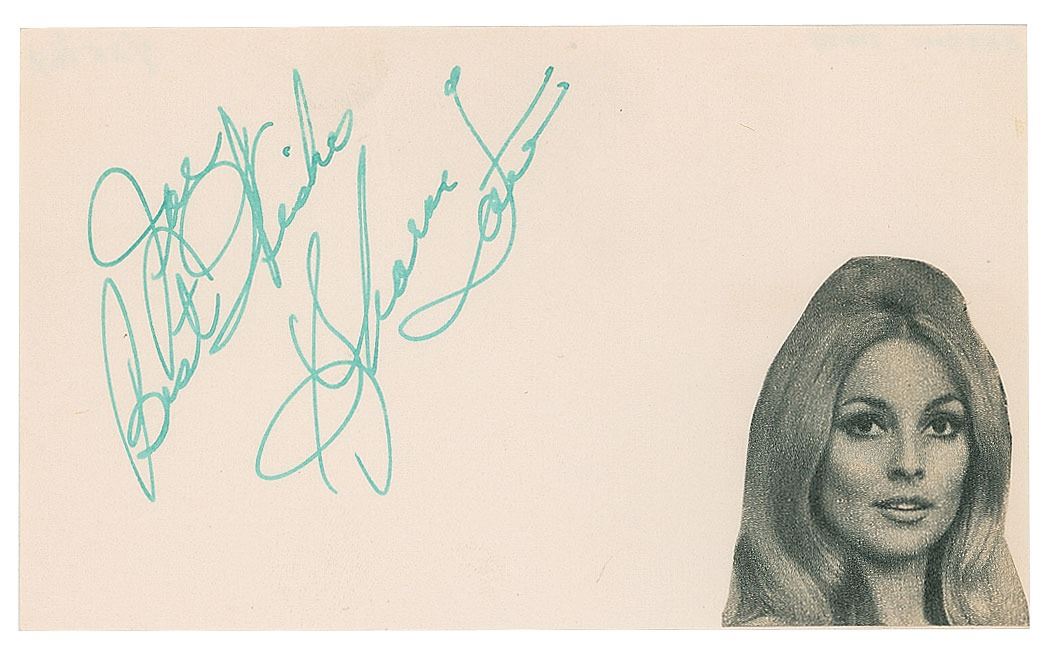 Vintage fountain pen signature and inscription, "Joe, Best wishes, Sharon Tate,” on an off-white 5 x 3 card bearing a small affixed image of the actress. Notation on the reverse dates the signature to January 25, 1964. In very fine condition. Originally obtained in person by a New York autograph collector who collected from the 1950s through the 2000s.
