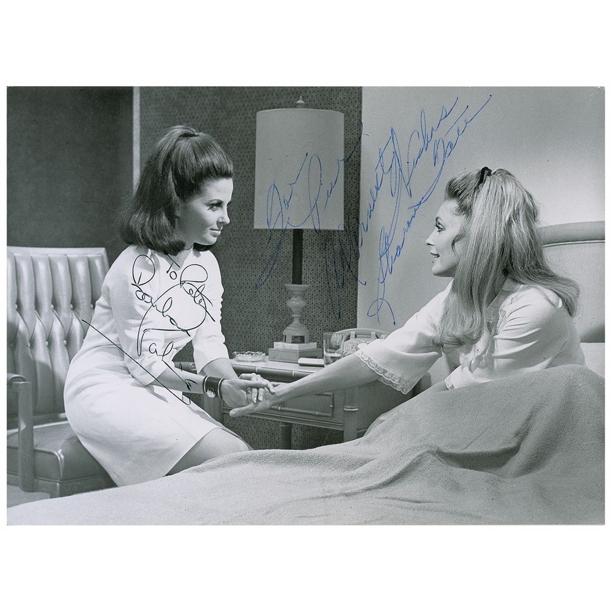 Promising American actress (born 1943) and wife of director Roman Polanski who was propelled into infamy when she was murdered by the Manson Family at the age of 26 in the notorious killing spree that shook the nation in the summer of 1969. Marvelous vintage glossy 9.5 x 7 photo of Tate and Barbara Parkins in Valley of the Dolls, signed and inscribed in blue ink, “For Piere, Warmest Wishes, Sharon Tate” and “To Peter, Barbara Parkins.” In fine condition, with some light surface creasing, impressions, and a bit of irregular ink adhesion. Any signed images from Tate are highly-desirable, and this one serves as a particularly fantastic example, featuring both the tragic actress and Parkins.