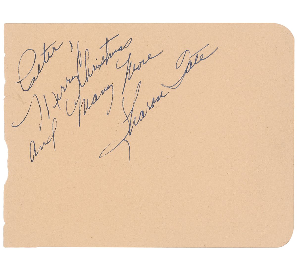 Promising American actress (born 1943) and wife of director Roman Polanski who was propelled into infamy when she was murdered by the Manson Family at the age of 26, in the notorious killing spree that shook the nation in the summer of 1969. Uncommon ink signature, “Peter, Merry Christmas and many more, Sharon Tate,” on a peach 6.5 x 5 album page. In fine condition, with a bit of irregular ink flow to a few strokes. Tate is quite rare in any form, with this being an exceptional example.