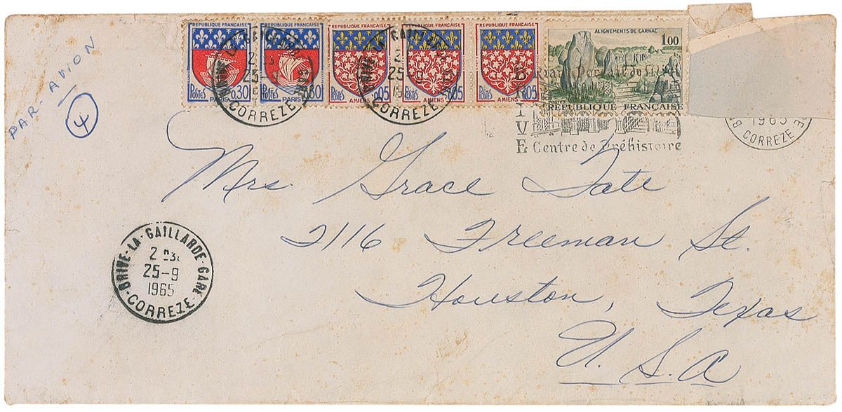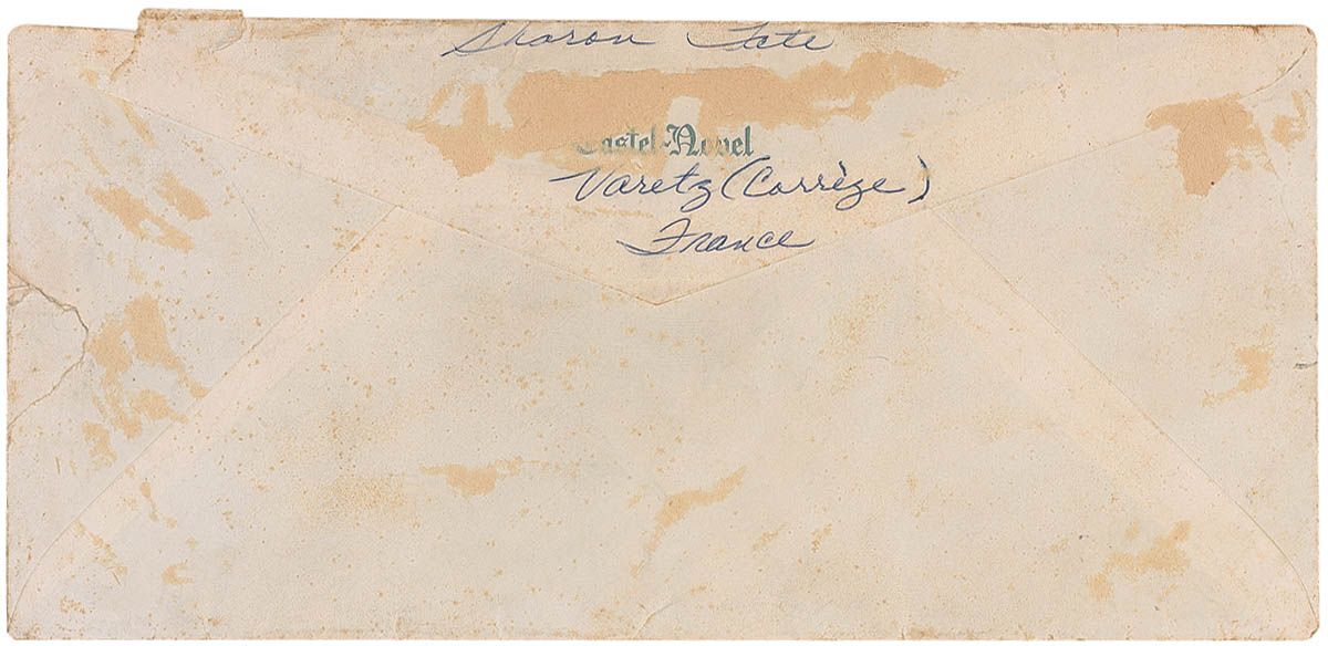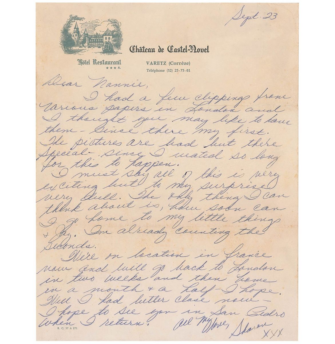 Promising American actress (born 1943) and wife of director Roman Polanski who was propelled into infamy when she was murdered by the Manson Family at the age of 26 in the notorious killing spree that shook the nation in the summer of 1969. ALS signed “Sharon,” one page, 8.25 x 10.5, Chateau de Castel-Novel letterhead, September 23, 1965. Letter to her grandmother. In part: “I had a few clippings from various papers in London and I thought you may like to have them—since there [sic] my first. The pictures are bad but there [sic] special—since I waited so long for this to happen. I must say all of this is very exciting but to my surprise very dull. The only thing I can think about is, how soon can I go home to my little things & Jay…We’re on location in France now and will go back to London in two weeks and then home in a month & a half—I hope.” Accompanied by the original mailing envelope, addressed in Tate’s hand, with her full signature, “Sharon Tate” in the return address area on the reverse. In very good condition, with scattered toning and soiling, and some show-through from mounting remnants to the reverse. Tate wrote this while filming her first feature, Eye of the Devil. An exceedingly scarce letter with great content from the start of her career—just the third ALS from the blonde starlet that we have ever offered.