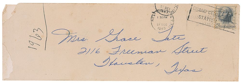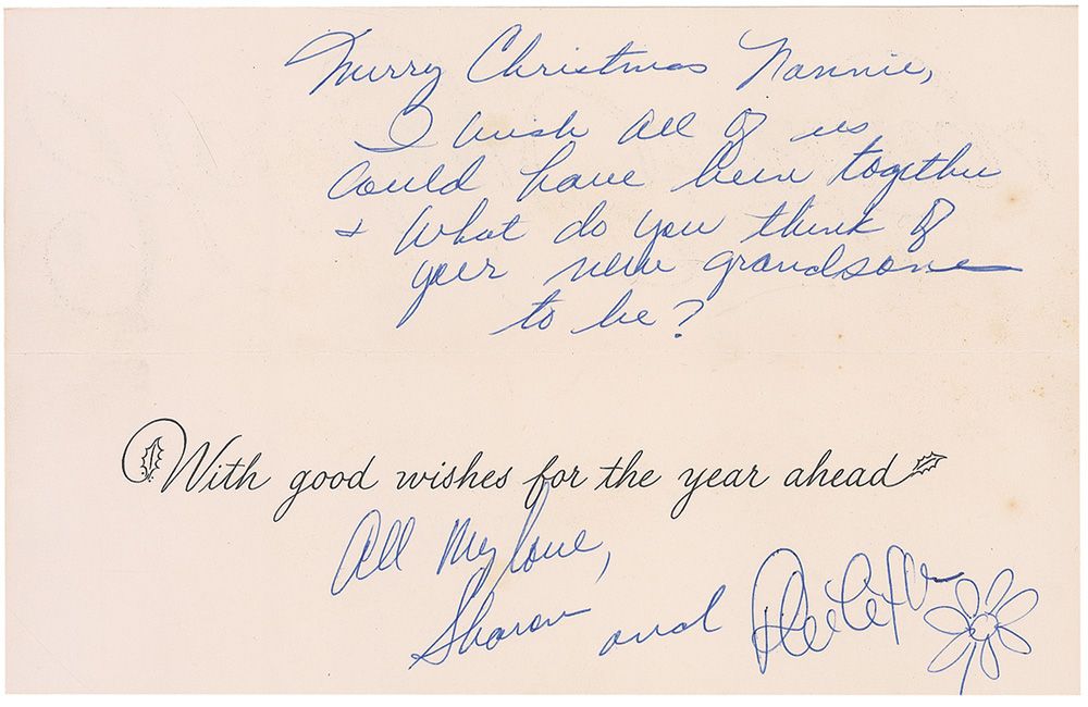 Christmas card, measuring 9.25 x 3 closed, opening to 9 x 6, with a pre-printed message inside. On the upper portion inside Tate writes “Merry Christmas Nannie, I wish all of us could have been together & What do you think of your new grandson to be?” Under the printed sentiment she signs “All my love, Sharon and,” and also “Phillippe,” her boyfriend Phillippe Forquet, adding a small flower sketch. In fine condition, with a bit of trivial toning. Accompanied by the original mailing envelope, addressed in Tate’s hand and postmarked New York, December 27, 1963. Tate had just begun her acting career, appearing in small roles in Mister Ed and The Beverly Hillbillies, in order to gain experience for bigger roles.