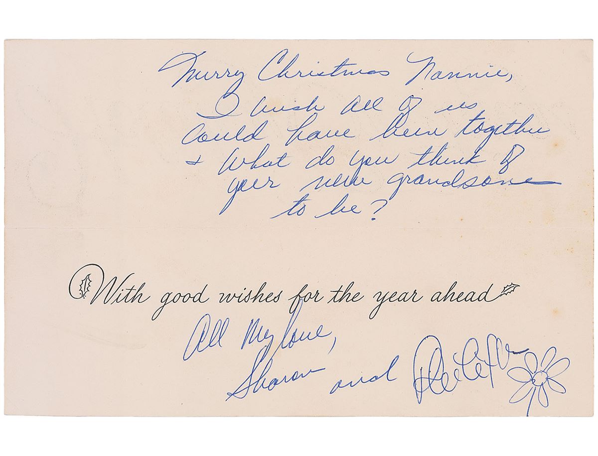 A Christmas card, measuring 9.25 x 3 closed, opening to 9 x 6, signed inside in blue ballpoint by Tate, “All my love, Sharon and,” and her boyfriend Phillippe Forquet, “Phillippe,” who adds a small flower sketch. On the upper inside panel Tate writes “Merry Christmas Nannie, I wish all of us could have been together & What do you think of your new grandson to be?” In fine condition, with a few spots of foxing to the right side. Accompanied by the original mailing envelope, addressed in Tate’s hand and postmarked New York, December 27, 1963.