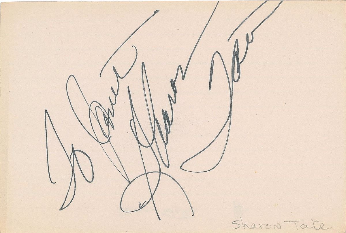 American actress (born 1943) and wife of director Roman Polanski who was murdered by the Manson Family in 1969. Felt tip signature, “To Janet, Sharon Tate,” on an off-white 6 x 4 card. In fine condition.