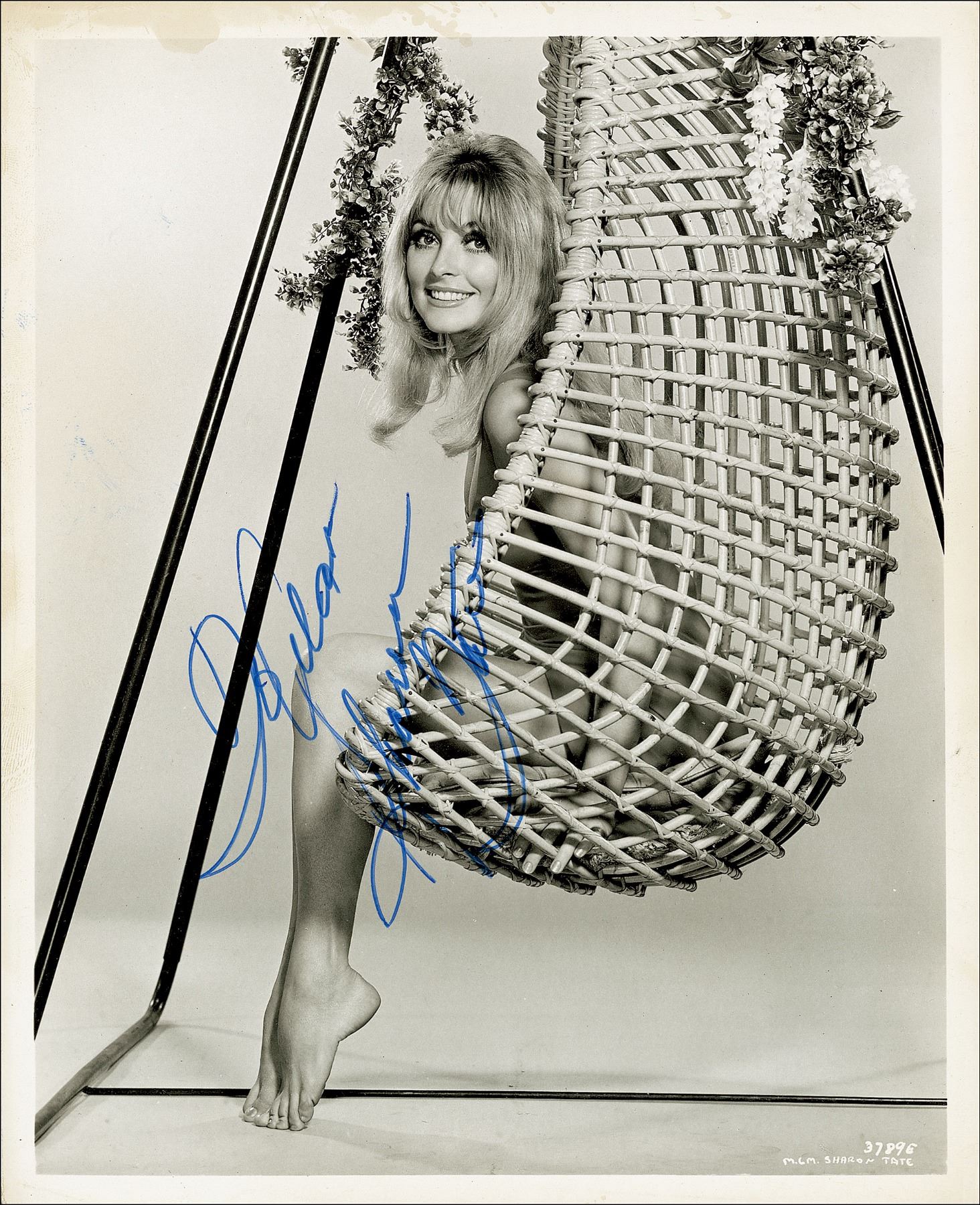 Rare glossy 8 x 10 publicity photo from the 1967 film Don't Make Waves, showing Tate seated in a hanging chair, signed and inscribed in blue felt tip, "To Alan, Sharon Tate." In fine condition, with some light marginal staining just touching the background at top edge, and easily matted out. Despite being billed below stars Tony Curtis and Claudia Cardinale, Tate and her Waves character, Malibu, earned a permanent place in pop-culture history as the direct inspiration for Mattel's enormously popular 'Malibu Barbie' doll.