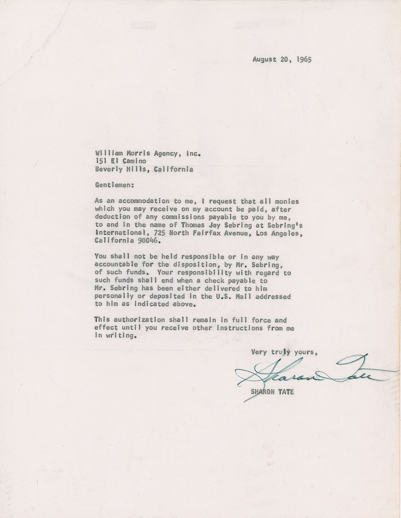DS, one page, 8.5 x 11, August 20, 1965. Official letter to the William Morris Agency, in part: "As an accommodation to me, I request that all monies which you may receive on my account be paid, after deduction of any commissions payable to you by me, to and in the name of Thomas Jay Sebring at Sebring's International…You shall not be held responsible or in any way accountable for the disposition, by Mr. Sebring, of such funds. Your responsibility with regard to such funds shall end when a check payable to Mr. Sebring has been either delivered to him personally or deposited in the U.S. Mail addressed to him as indicated above." Signed at the conclusion in black felt tip by Sharon Tate. In fine condition, with light creasing, predominantly to the lower blank area and right edge. Thomas John Kummer, known professionally as Jay Sebring, was a celebrity hairstylist and ex-boyfriend of Sharon Tate. The two were infamously murdered by members of the Manson Family in August 1969. An uncommon and significant document.