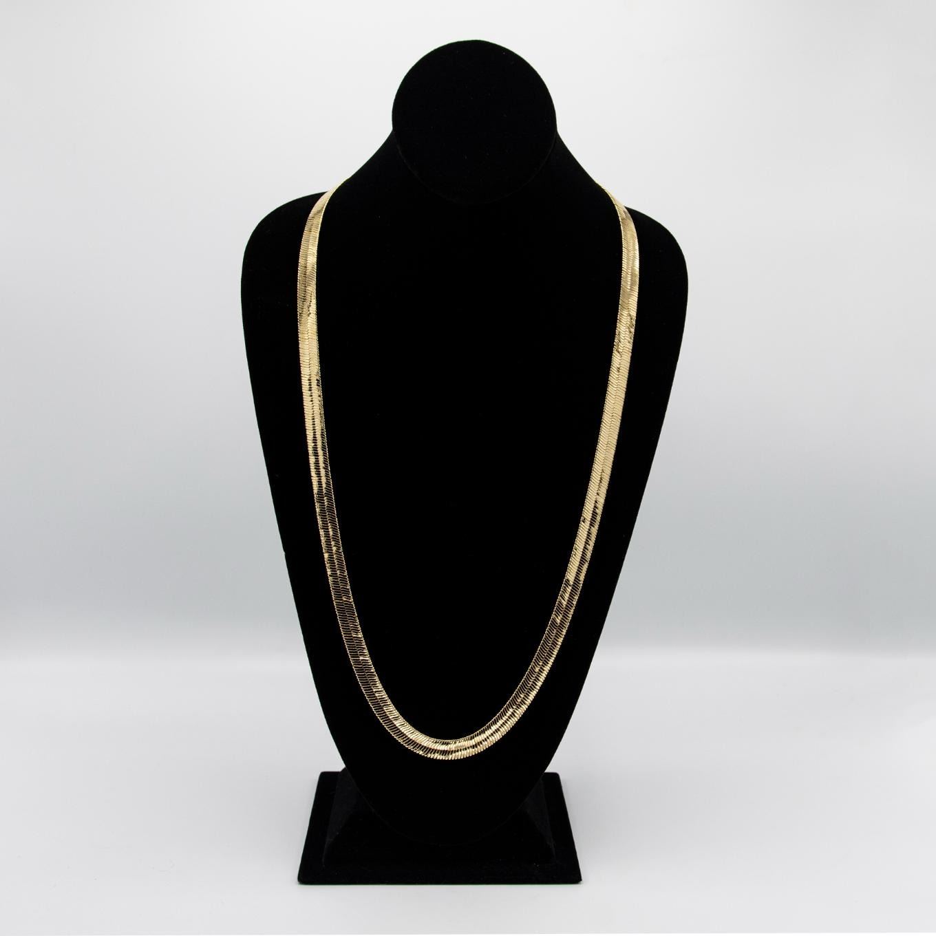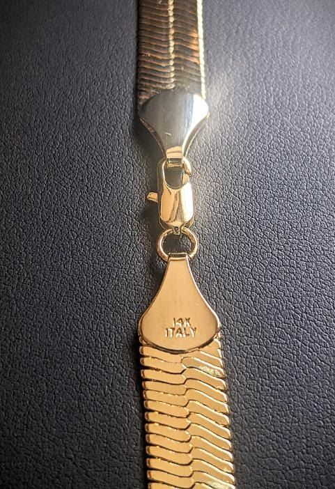 Sharp 42 Gram 14 Kt Gold Plated Herringbone Necklace. This herringbone necklace is a fine solid Italian cut. It is 30 inches long and a healthy 9.5 mm.