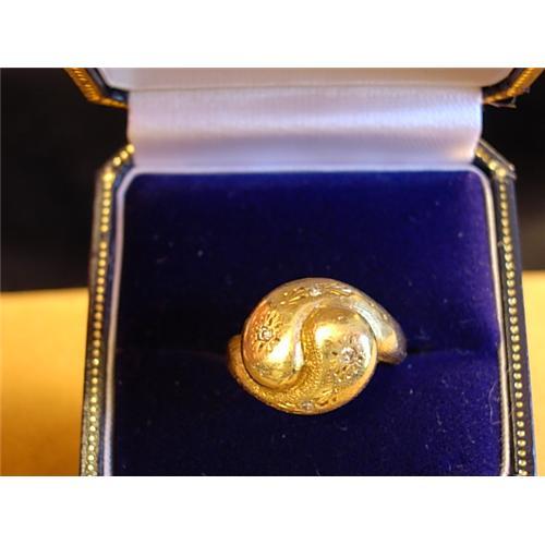 Sharp circa 1930s diamond and 18kt yellow gold double snake ring set with 4 small single cut diamonds set in a star cut pattern into a modified double snake ring. Engraved details. Very nice look. Can be sized up.