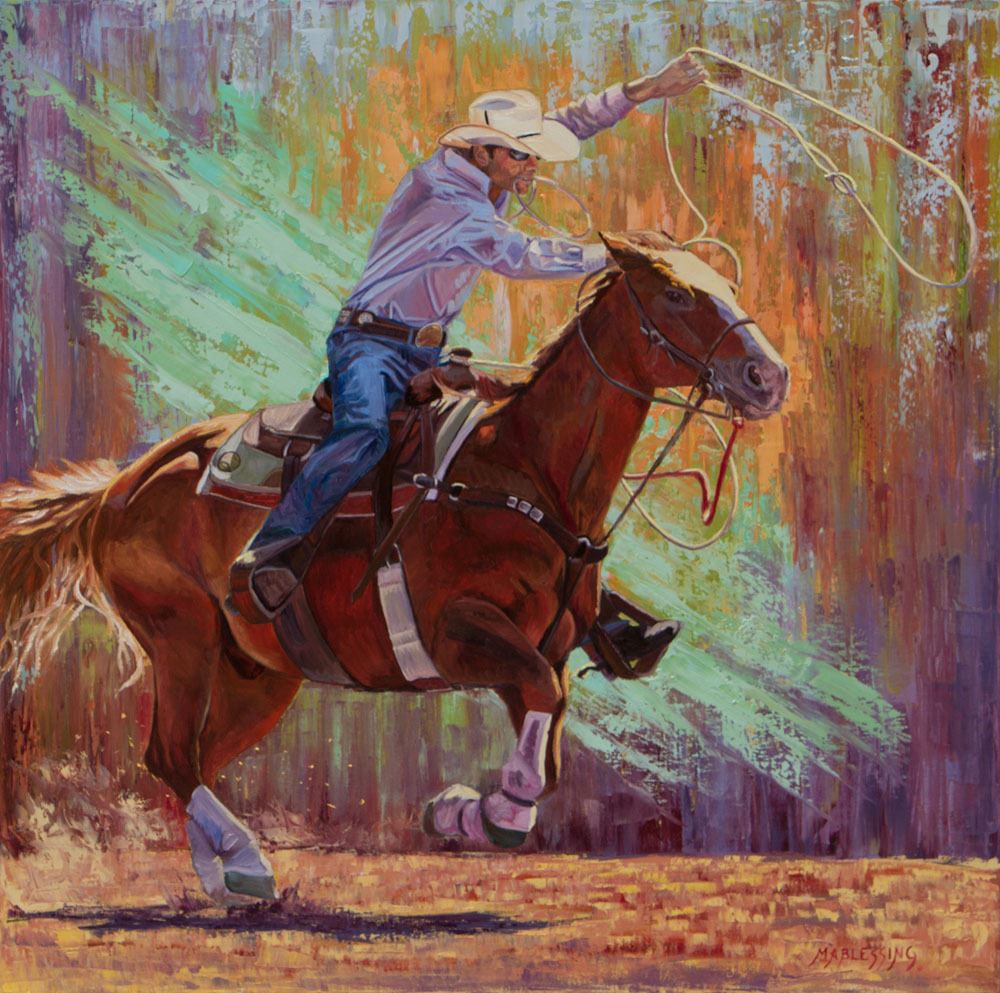 Artist: Meagan Abra Blessing.  Title: Sharp Shooter.  Size: 36" x 36".  Medium: Oil.  Description: I come by my love of rodeo honestly; my grandfather and uncles were team ropers.  The rodeo atmosphere is exhilarating and I wanted to capture it in a contemporary style while giving a nod to the quintessential cowboy that has traditionally represented western life.