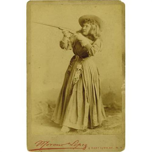 <B>Sharp Shooting Cowgirl Cabinet Card.</B></I> 4.25” x 6.5”, with a Moreno & Lopez, New York studio mark on the lower photo mount, a bit toned on the verso with the usual bumping to the corners, else very good. Though a previous owner has written “<I>Annie Oakley</B></I>” on the verso, this is certainly just another unknown sharp-shooting cowgirl. Of particular note are the beaded Indian pouches hanging from her belt. A desirable image. <BR><BR><b>Shipping:</b> Flat Material, Small (<a target="_blank" href="http://www.heritageauctions.com/common/shipping.php">view shipping information</a>)