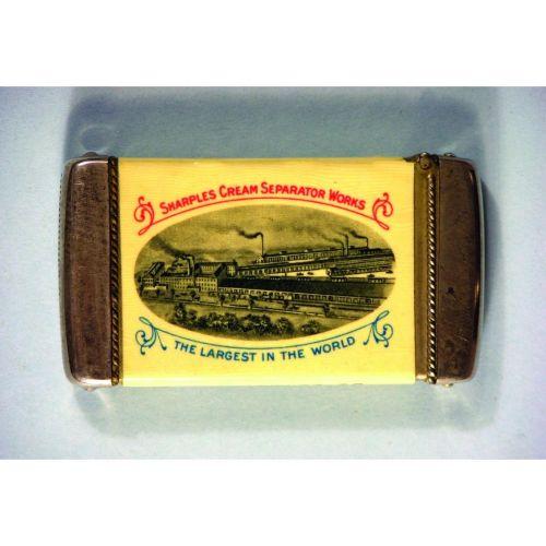 Sharples Cream Separator Celluloid Match Safe, has factory scene on one side and woman operating separator on other. Excellent condition. 1 1/2 X 2 3/4 inches