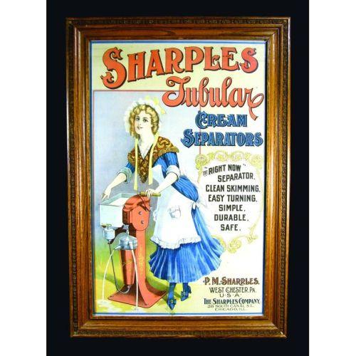 Sharples Tubular Cream Separator Paper Sign, in period frame. One of their earliest advertisements. Has a few wrinkles, possibly slight fading and a tear at 6:00 otherwise very good condition. 17 1/2 X 27 1/2 inches.