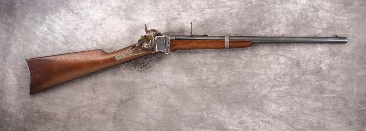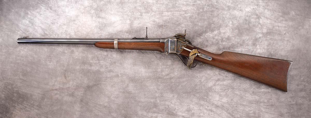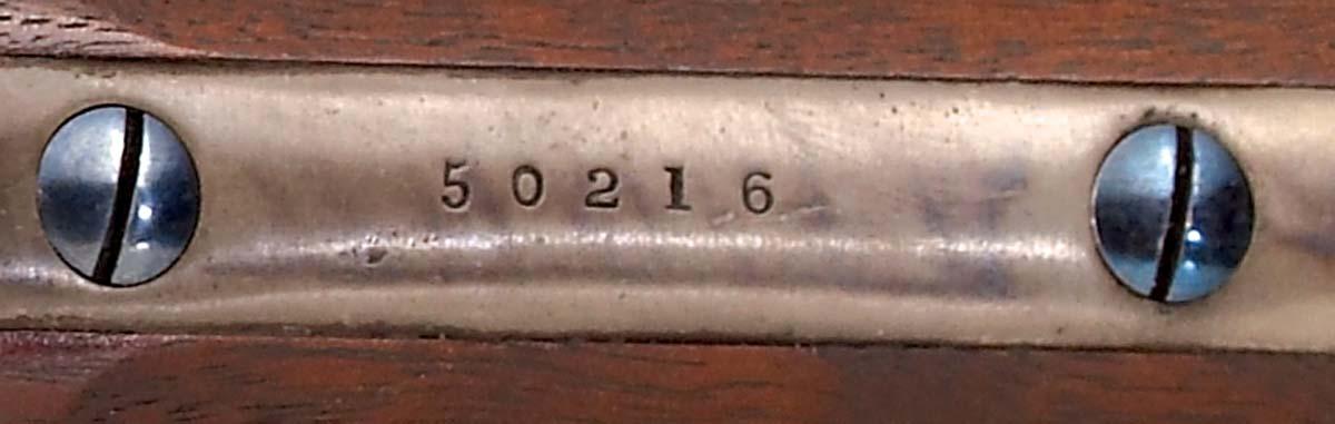 Ser # 50216 converted to .50-70 centerfire. 22" barrel, excellent, bright, probably unfired bore. Virtually all the blue and case color from arsenal refitting still exists. Fine wood has excellent sharp cartouches. This is in the top 1% of existing Indian Wars carbines