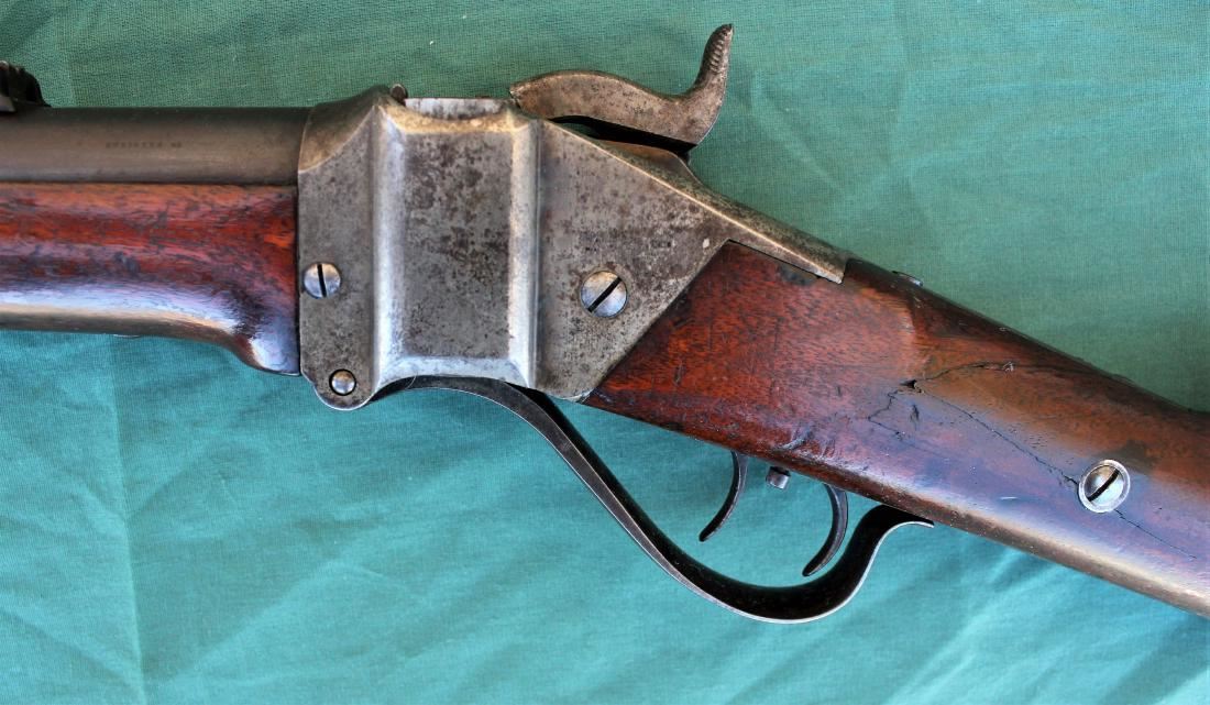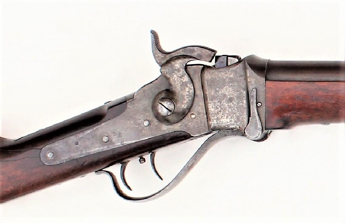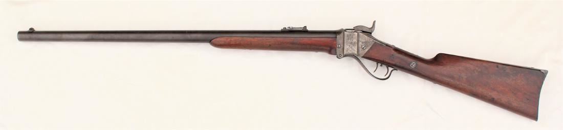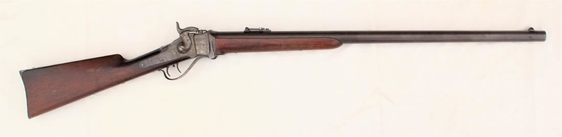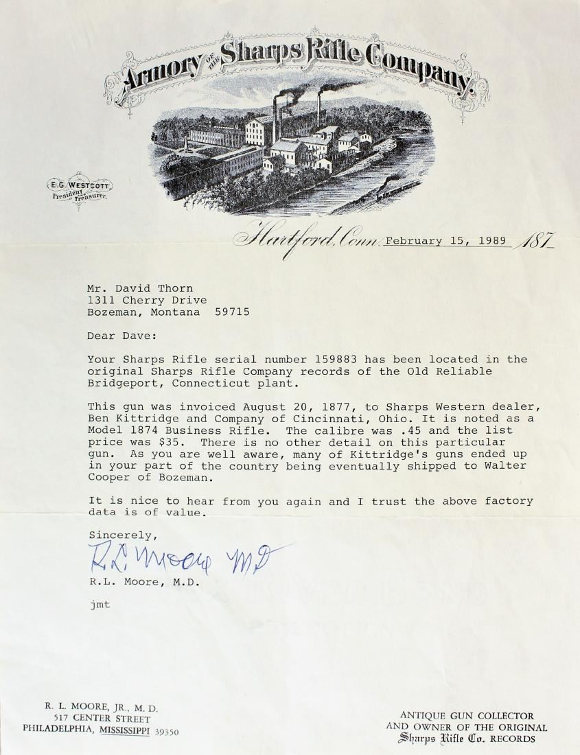 Desirable Montana shipped frontier rifle chambered in 45-70 caliber, with factory letter confirming this rifle was invoiced on August 20, 1877, to Benjamin Kittredge & Co. of Cincinnati, Ohio, as a Model 1874 Business Rifle in .45 for $35. It also notes that many Kittredge guns were sent further west including being shipped to Walter Cooper of Bozeman, Montana. The rifle has a blade front sight, notch and folding ladder rear sight, standard Bridgeport barrel markings, double set triggers, unmarked lock, standard Sharps Rifle Co. patent marking on the left side of the action, smooth stock and forearm, and rifle buttplate. Matching numbers are found on the forearm, bottom of the barrel, and upper tang.