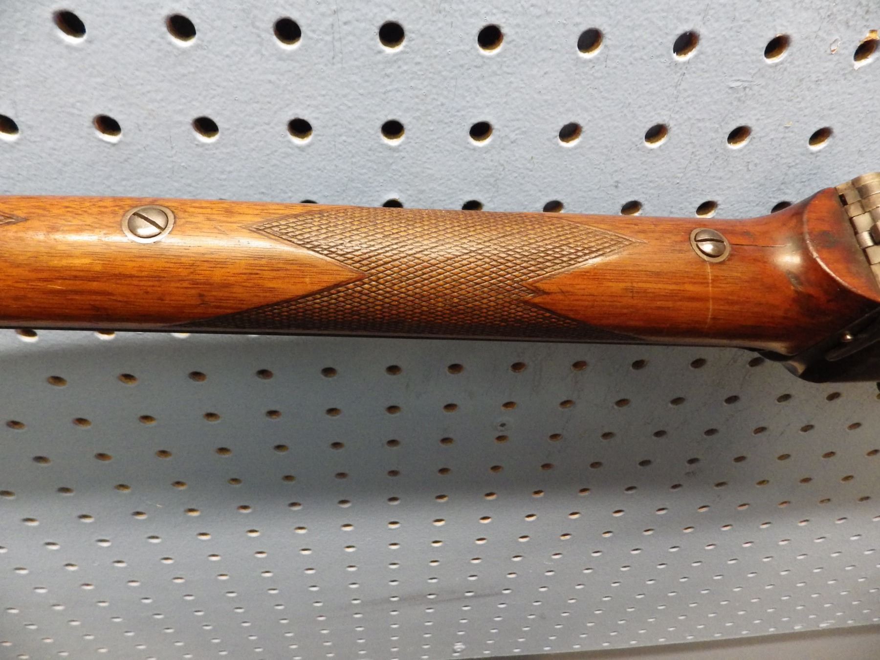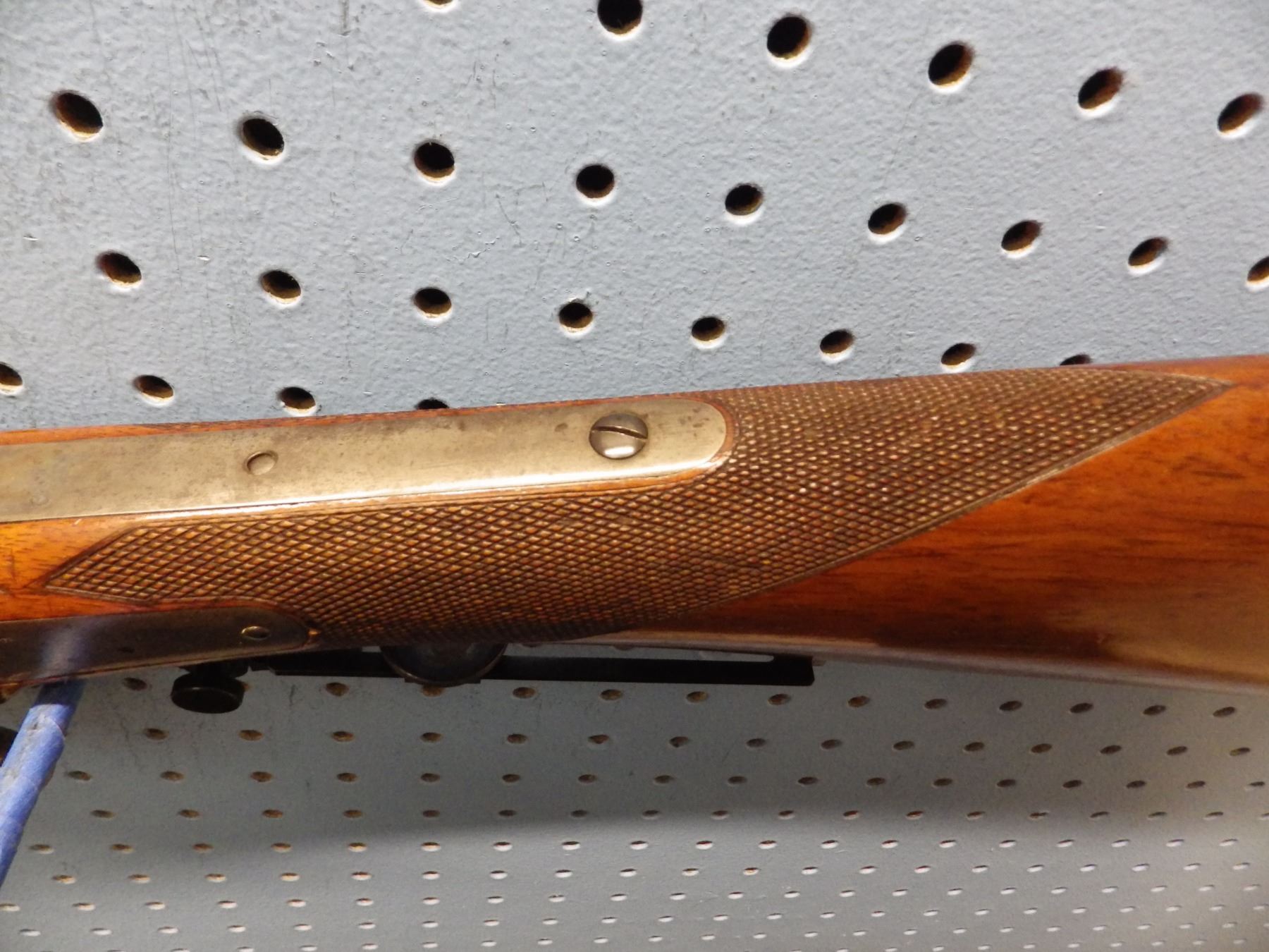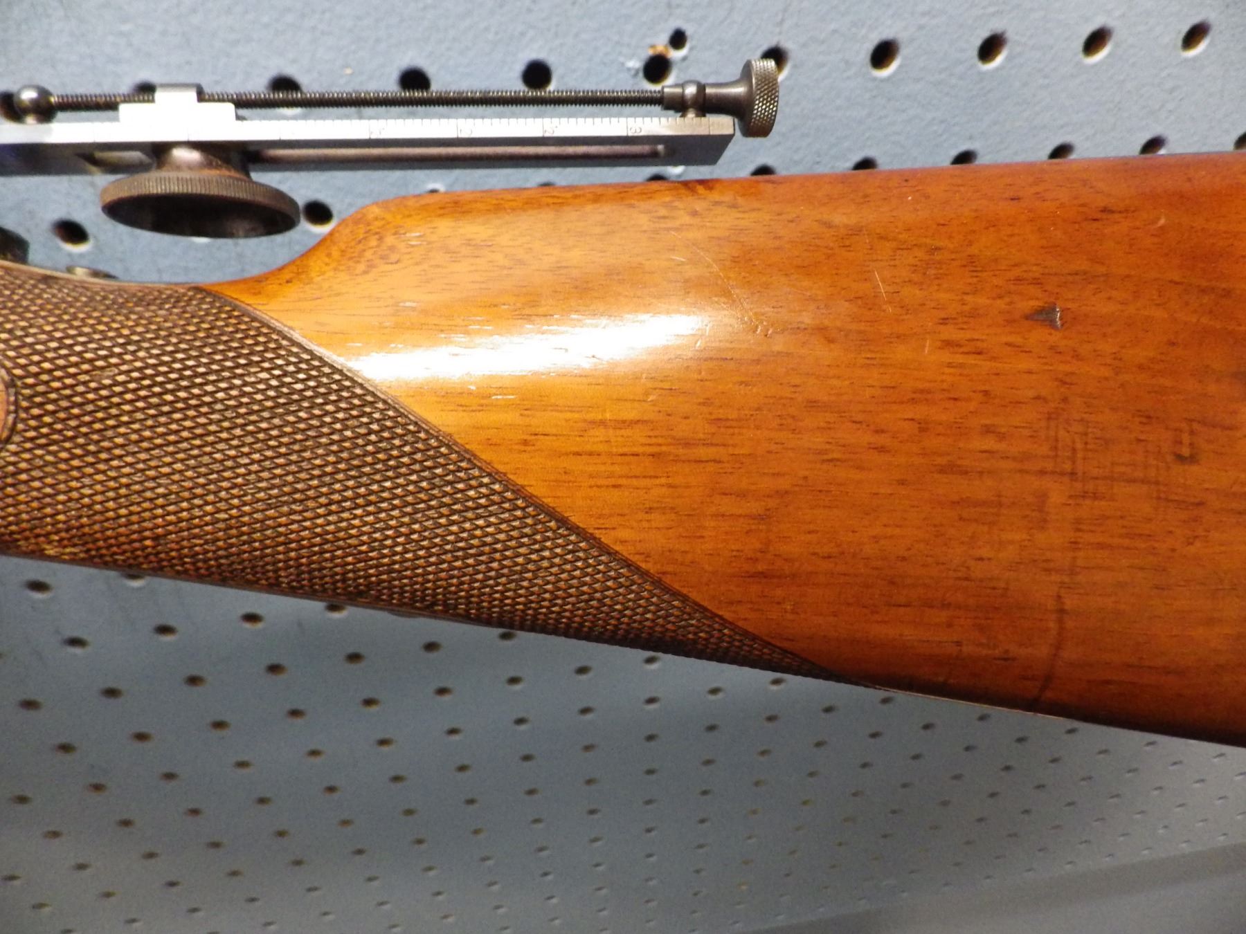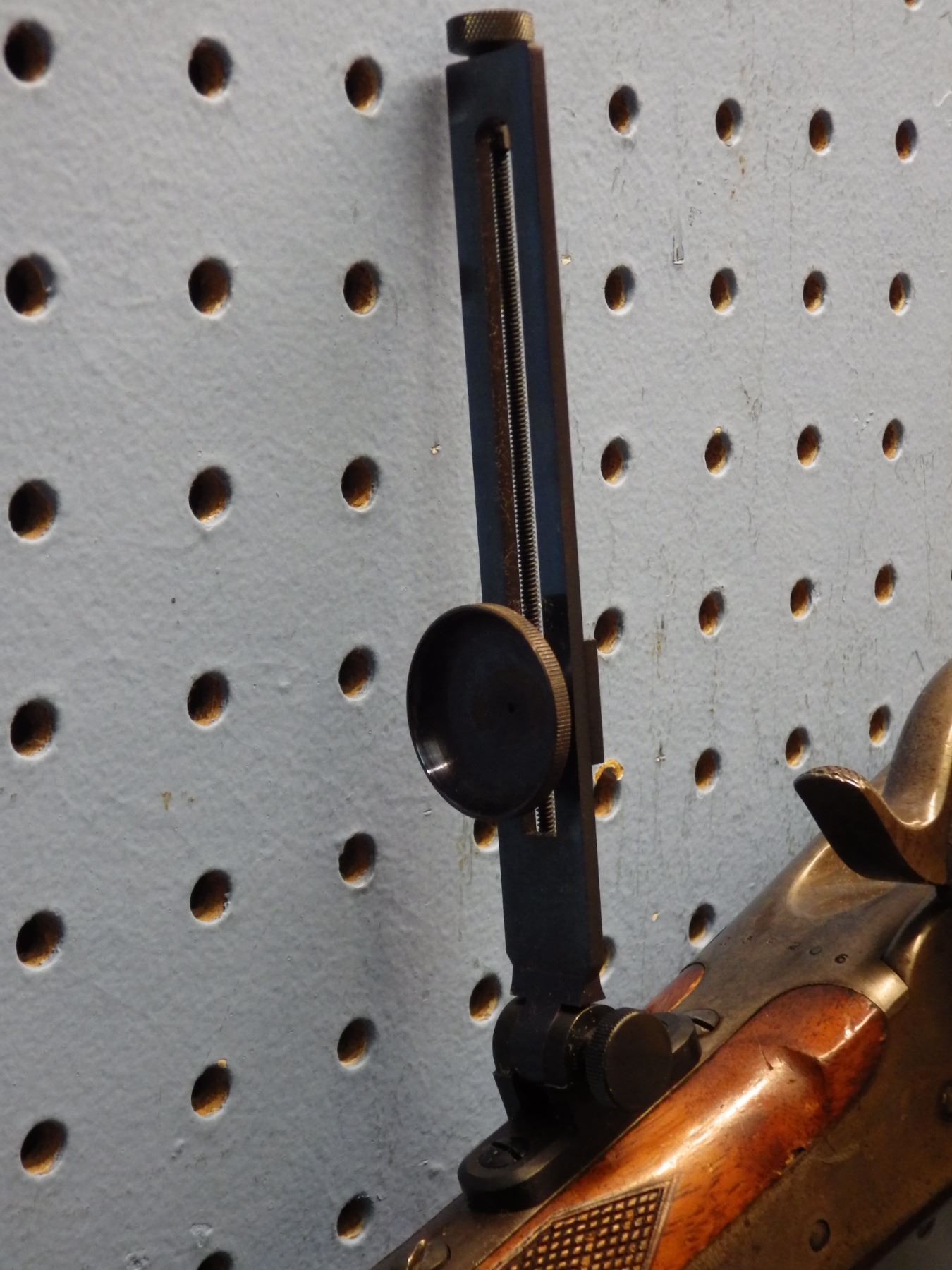 Sharps 1874 long range target rifle, 45 6/10" (45-100) case, serial number 158206. Research by Ron Serbin showed that it was ordered by a businessman in Almonte Ontario who is recorded as having shot at the long range matches in Bisley England. Original barrel was cut down to 26" and still has an excellent bore. The rifle was rebarrelled by Ed Webber, the Montana gunsmith and restored to its original 34" length in 45-100 with a mint bore. … CONSIGNOR # F - 7. -- BORE CONDITIONS PROVIDED BY CONSIGNOR