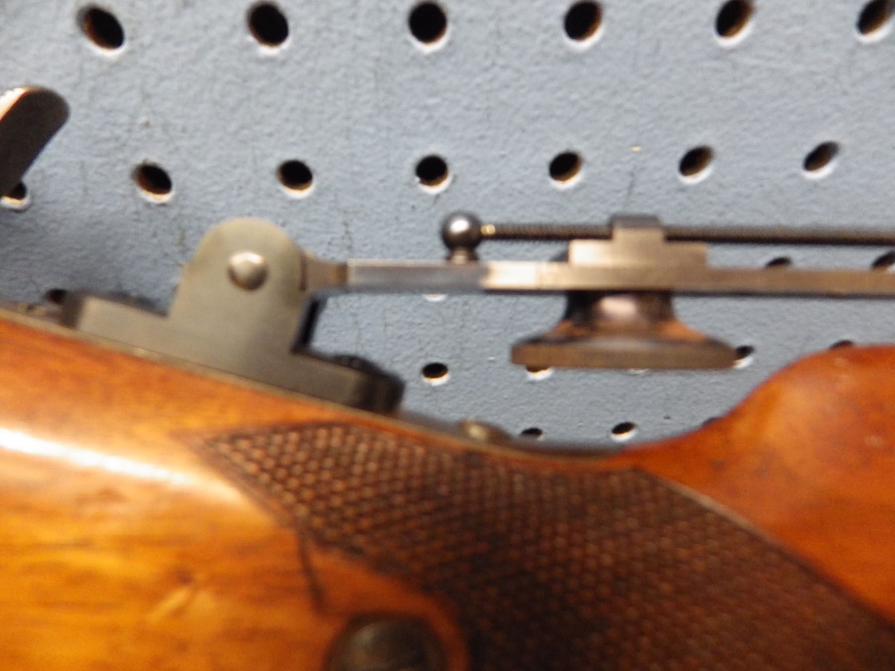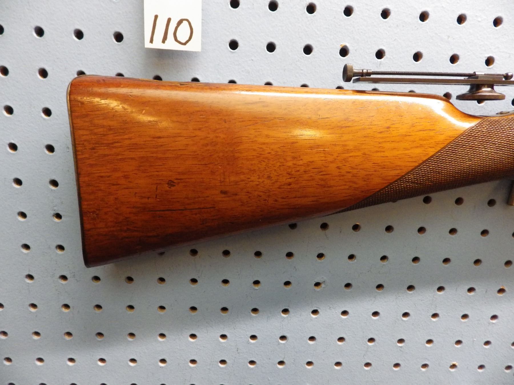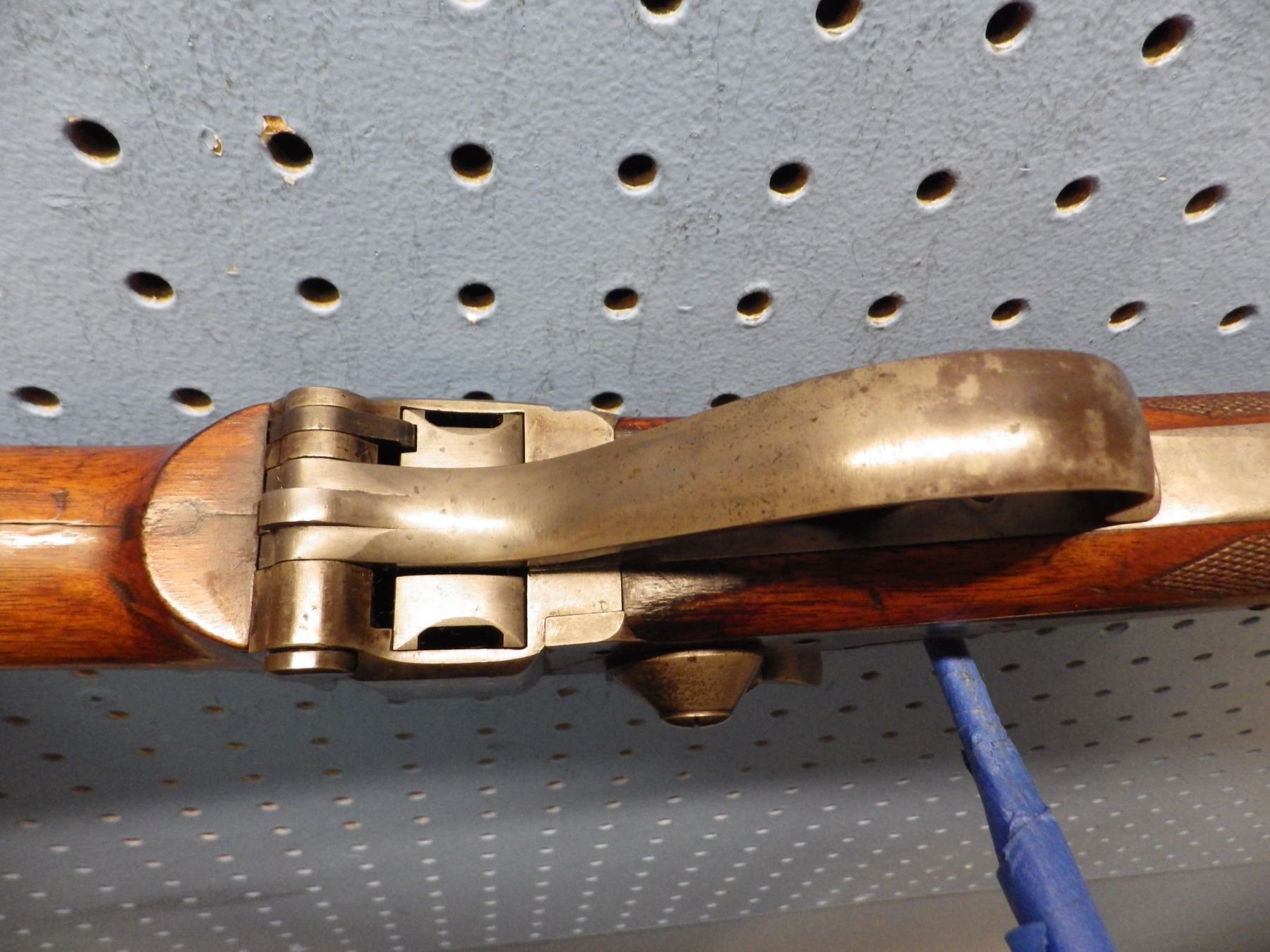 Sharps 1874 long range target rifle, 45 6/10" (45-100) case, serial number 158206. Research by Ron Serbin showed that it was ordered by a businessman in Almonte Ontario who is recorded as having shot at the long range matches in Bisley England. Original barrel was cut down to 26" and still has an excellent bore. The rifle was rebarrelled by Ed Webber, the Montana gunsmith and restored to its original 34" length in 45-100 with a mint bore. … CONSIGNOR # F - 7. -- BORE CONDITIONS PROVIDED BY CONSIGNOR