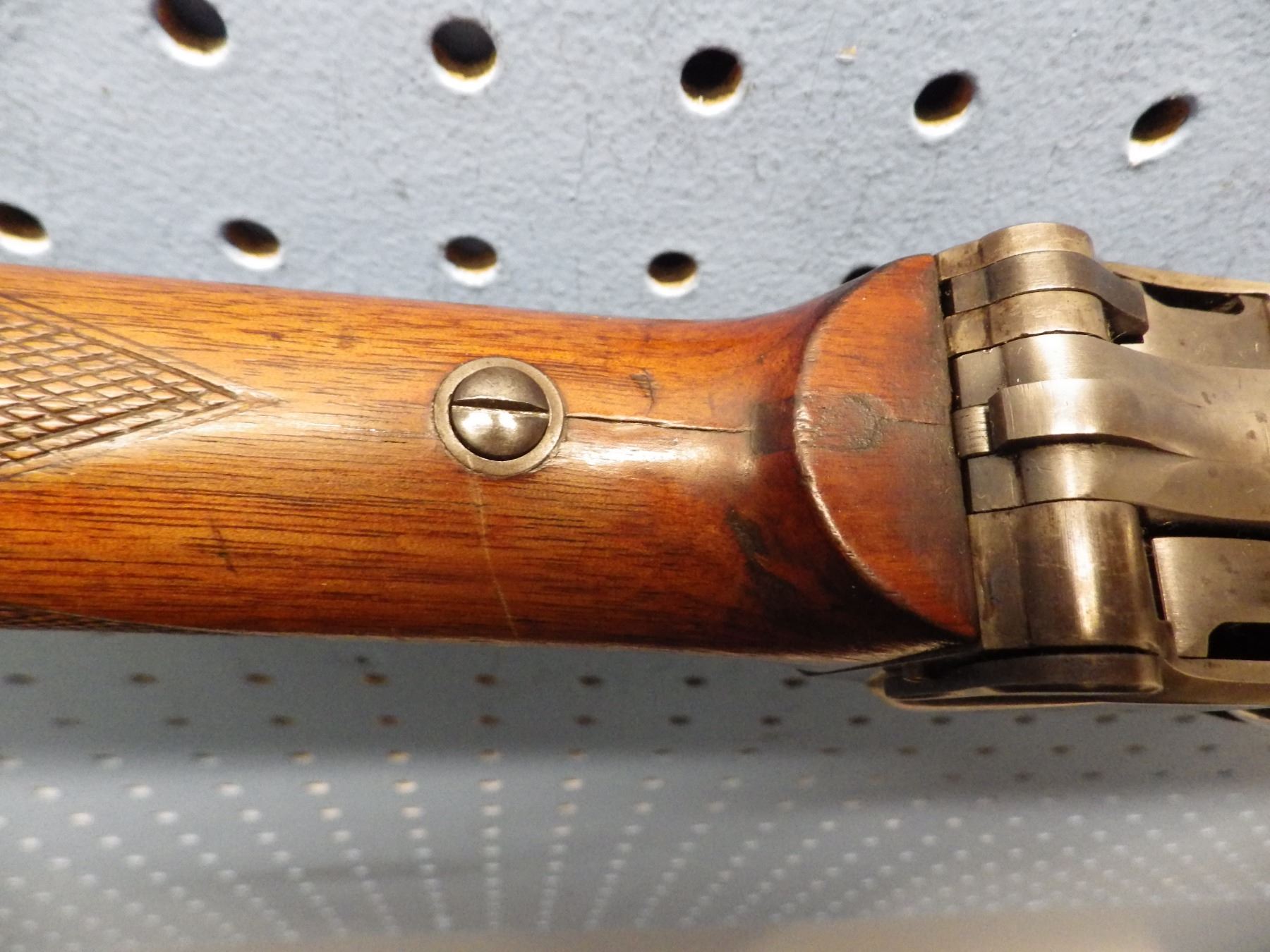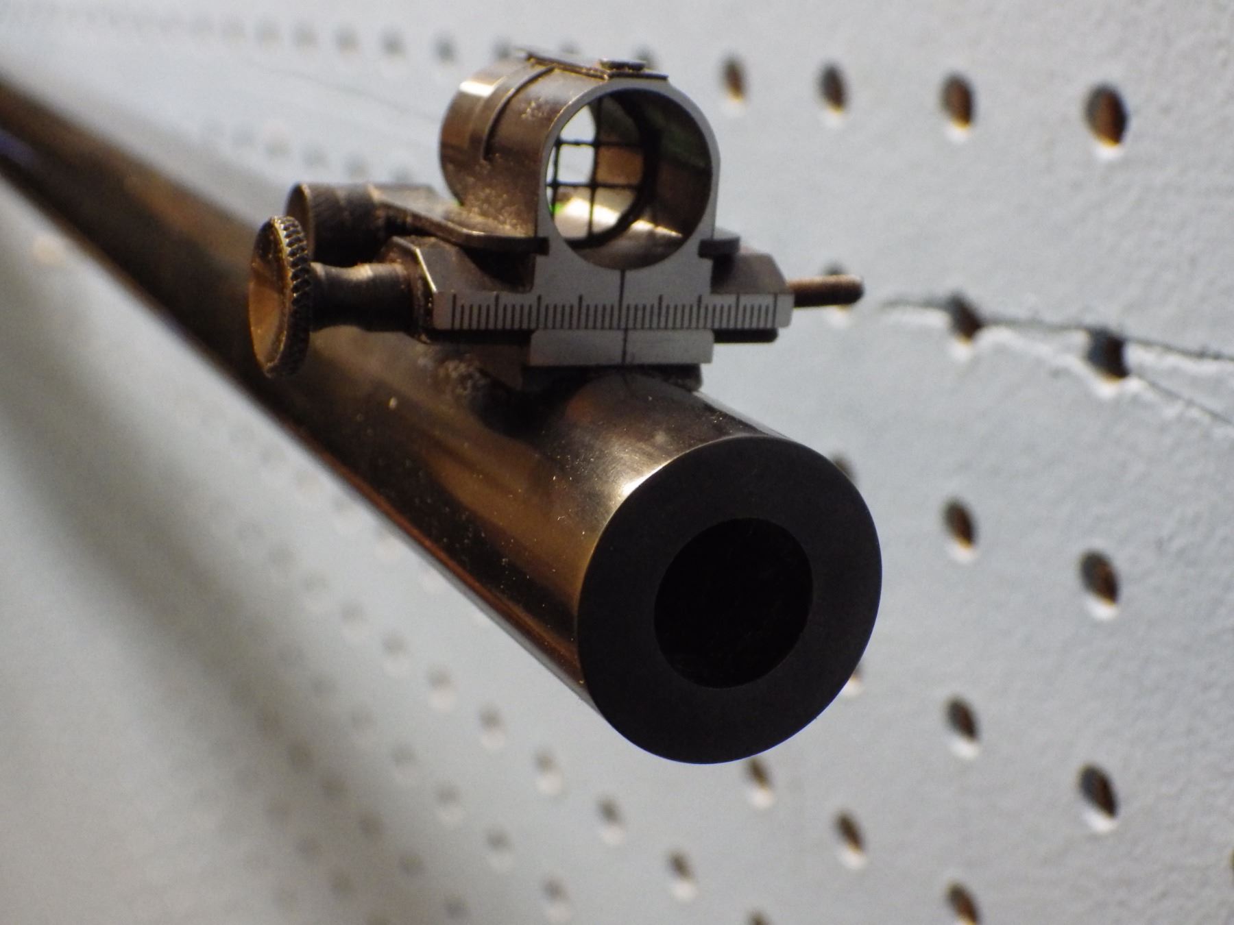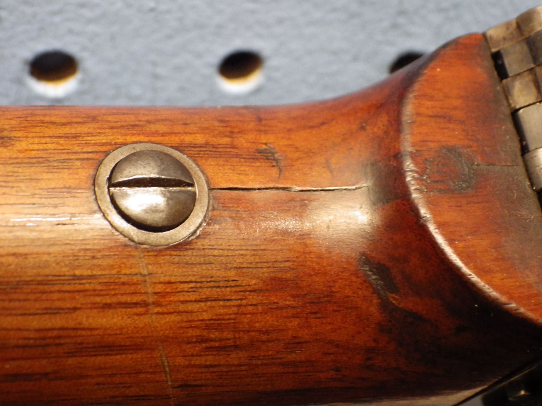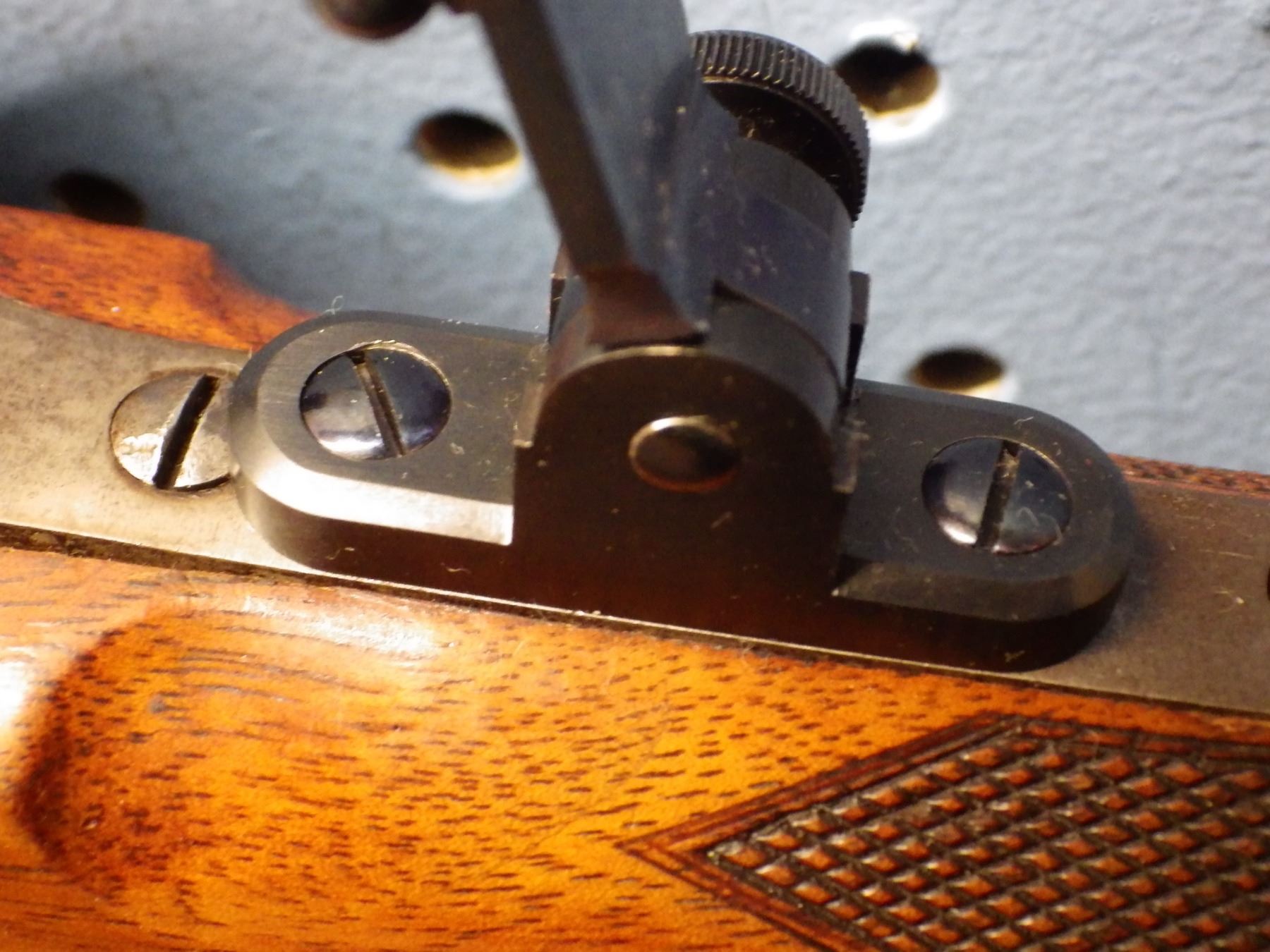 Sharps 1874 long range target rifle, 45 6/10" (45-100) case, serial number 158206. Research by Ron Serbin showed that it was ordered by a businessman in Almonte Ontario who is recorded as having shot at the long range matches in Bisley England. Original barrel was cut down to 26" and still has an excellent bore. The rifle was rebarrelled by Ed Webber, the Montana gunsmith and restored to its original 34" length in 45-100 with a mint bore. … CONSIGNOR # F - 7. -- BORE CONDITIONS PROVIDED BY CONSIGNOR