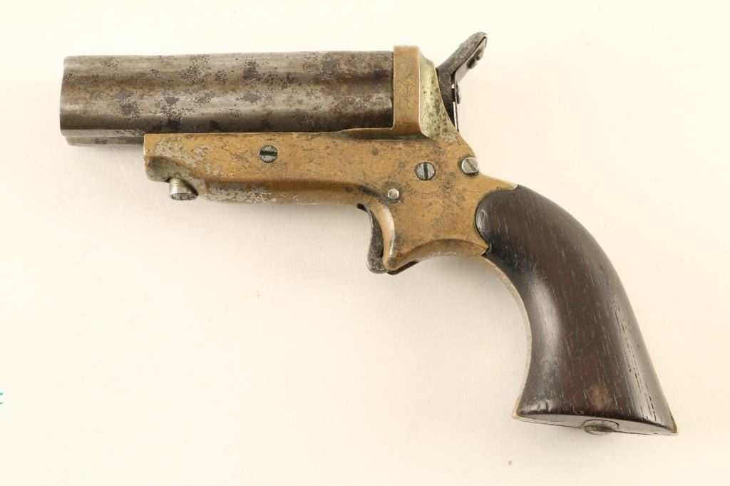 Manufactured circa 1859 to 1874. Features 3" barrel assembly that slides forward to load/unload, single action spur trigger, no front sight, groove rear sight. Bores are rough, dark & pitted, with traces of rifling. Barrel assembly is mostly bare metal with darker color in pits and in bottom of shallow dents. Brass frame retains traces of nickel finish that display puckering and peeling; brass is darkened with patina. Smooth wood grips are very good condition. Hammer does appear to retain a full cock notch; rotating striker appears to rotate properly, firing pin tip is broken. Frame marked on left "C. SHARPS / PATENT1859" Condition is NRA Fair - for Display Only *** Antique Firearm ***