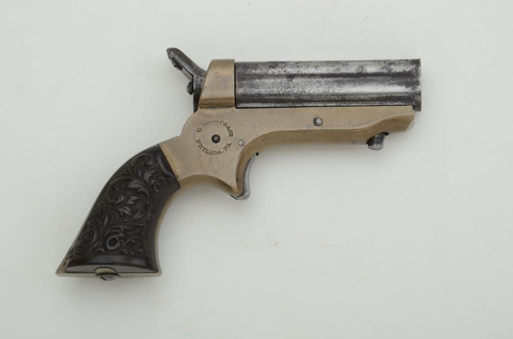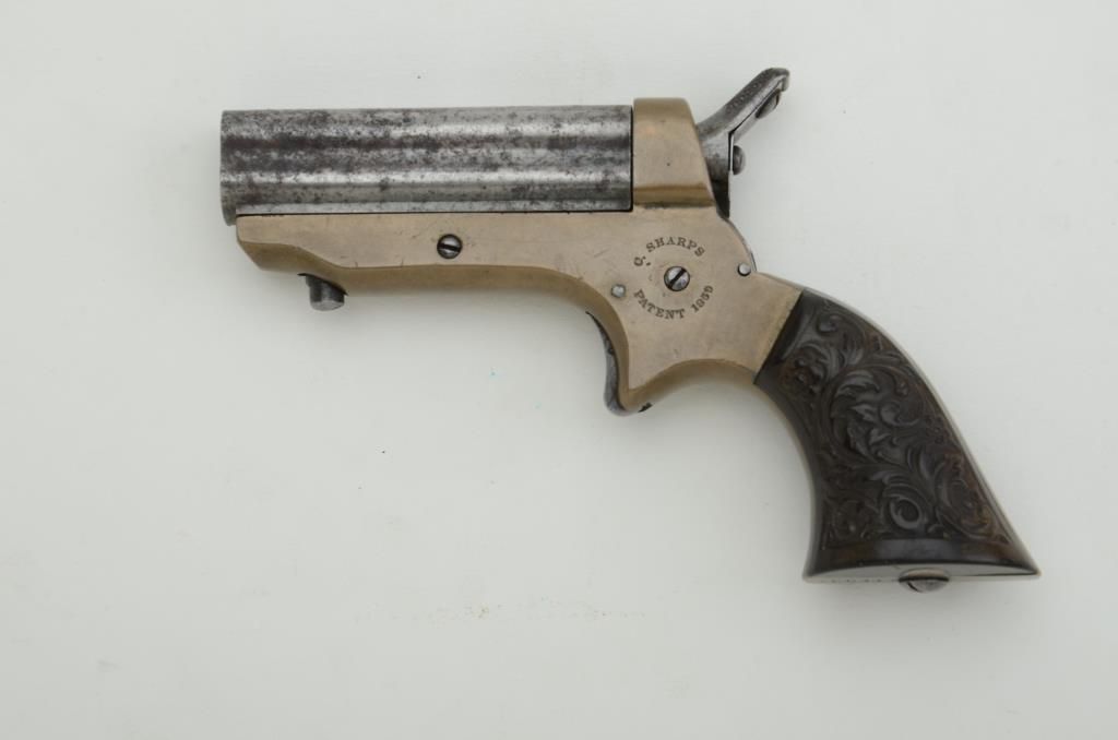 Sharps 4-barrel derringer, .22 cal., 2-1/2” barrels, brass frame, hard rubber grips, 36629 in over