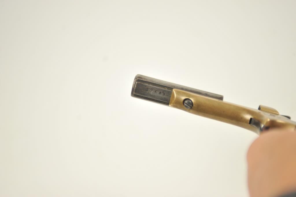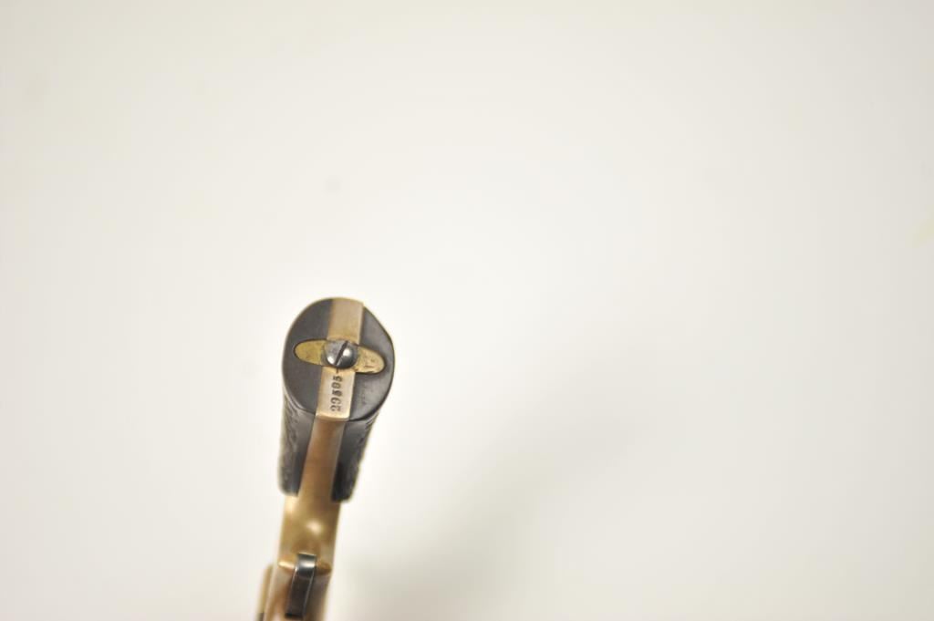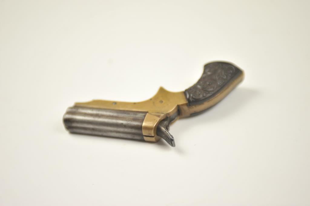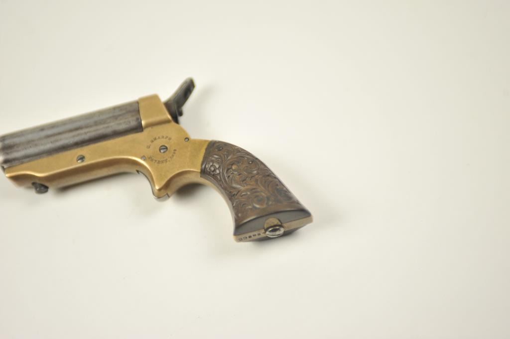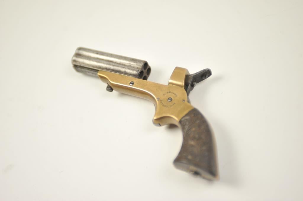 Sharps 4 shot derringer in .22 caliber with early forward release and floral gutta percha grips, S/N 29595. Made in Civil War era. Good markings and natural patina. Good grips. The action is tight and the hammer revolverproperly. Above average overall. (Antique) Est.: $300-$600