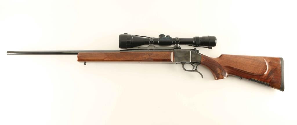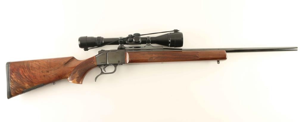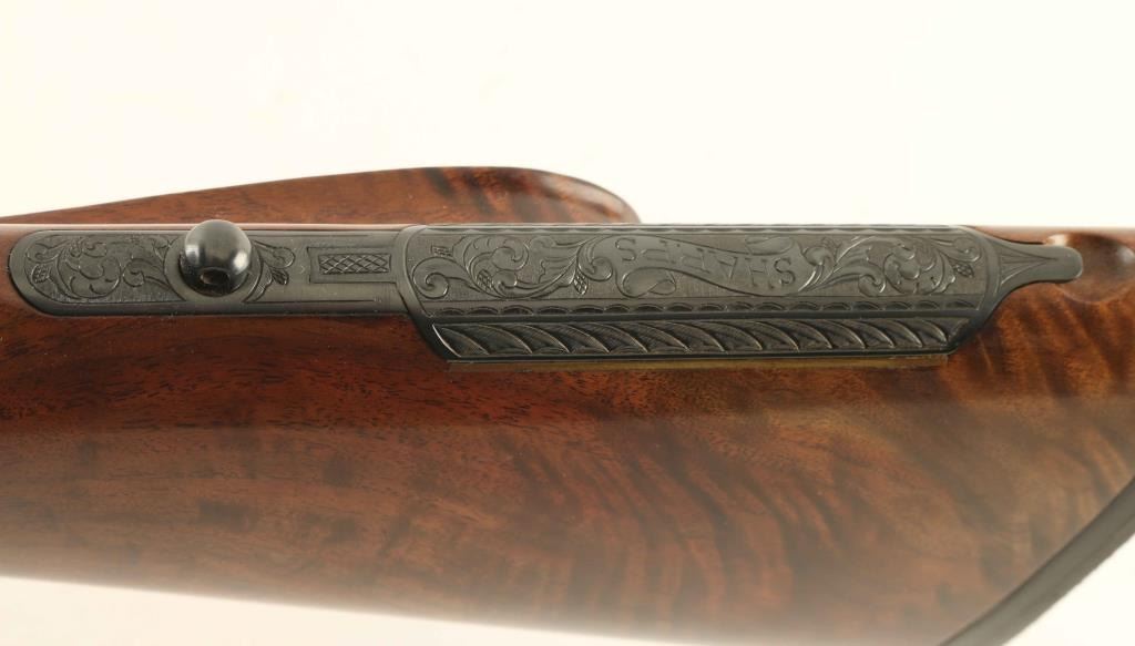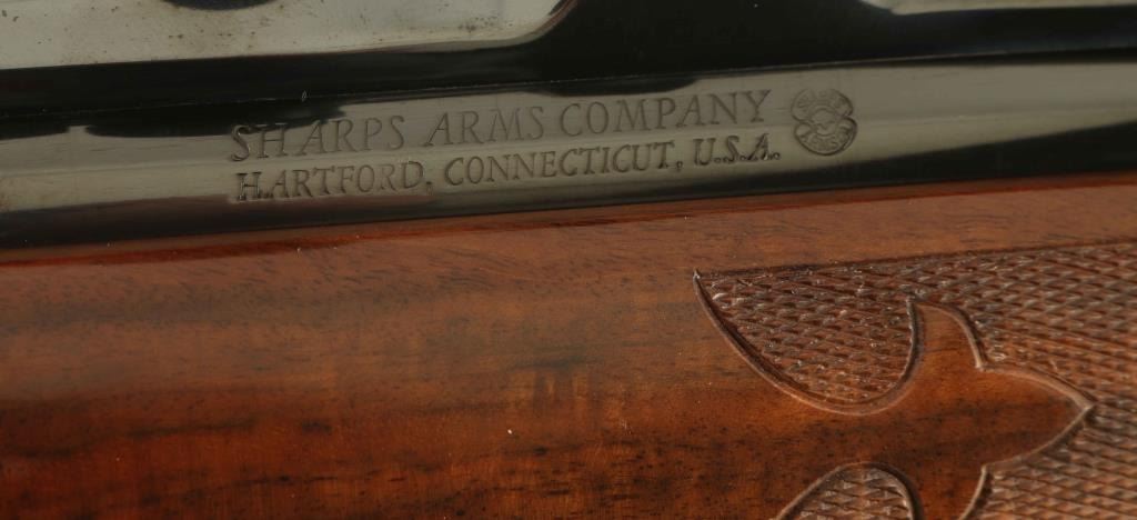 SN: CS24 Exceptional and rare deluxe grade single shot falling block rifle chambered in .22-250 Remington. Manufactured circa 1970-1977 with only 500 reported to have been produced. Features a high polished blued finish, 26" tapered barrel without provisions for sights, installed Shepherd 3-10x scope with dual reticle, single set trigger, jeweled breech block with automatic safety, hand engraved lever with scroll design, swivel studs, fancy checkered high grade walnut beavertail forend and pistol grip shoulder stock with right handed cheek rest, factory recoil pad & cartridge storage compartment which has a hand engraved cover inscribed "SHARPS. Includes a factory hard case #CS300 with foam inserts. Rifle exhibits approximately 99%+ of it's original finish showing a few dots of oxidation on the receiver with no other wear observed. Action is smooth, the bore is pristine, optics are sharp, and the wood stocks are near fine with light scuffs. Condition is NRA Excellent. ***Modern Firearm***