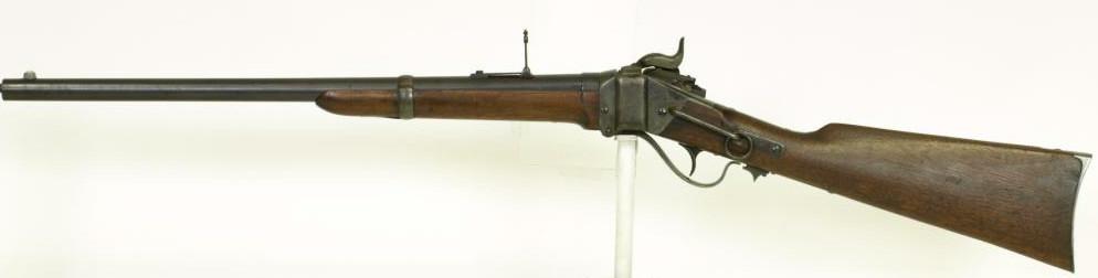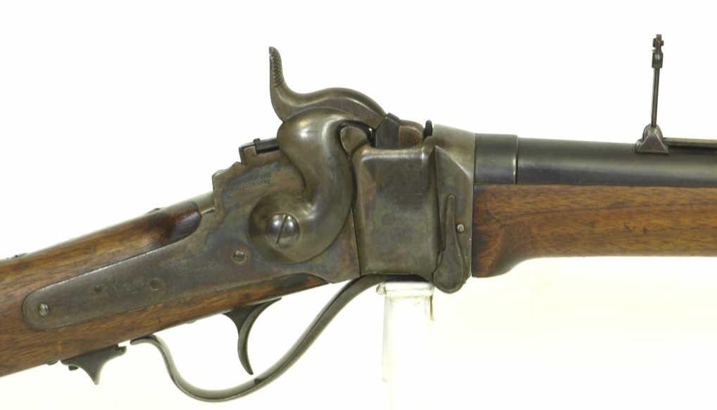 conversion SN C29261, 22" barrel, carbine shows very good condition the barrel with blue drifting to plum patina, strong case color to receiver and hammer, lever with case color drifting to silver gray, original sights intact. Walnut stock showing good condition, strong visible DFC ribbon cartouche to left side, some dings and scratches. Left side receiver marked C Sharps Pat Sept. 12 1846, right side marked RS Lawrence Pat. April 1859 and C Sharps Pat. Oct. 5 1852.Top of barrel marked Sharps Rifle Manufg. Co. Hartford Conn. Top of barrel also marked New Model 1865. NO FFL required.