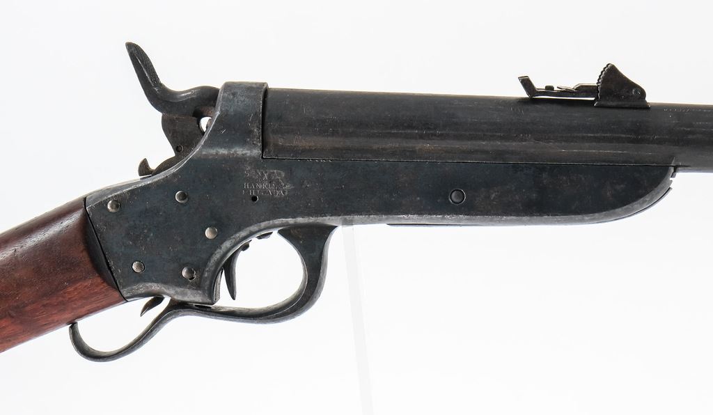 Sharps & Hankins 1859 single shot, breech loading Navy Carbine. This Sharps and Hankins .52 caliber rim fire rifle, patented in 1859 and originally with a leather wrapped barrel, was used by the Navy. When the trigger guard is pulled down the barrel moves forward in the frame to open the chamber for loading. This was one of the first breechloaders to use self-contained metal cartridges. This example appears to be complete with the exception of the leather barrel cover. There remains a great deal of original blue finish on the barrel and action. The action functions as expected. The left side of receiver is marked "SHARPS PATENT 1859" with P G G stampings which may be inspector markings. The right side is marked "SHARPS & HANKINS PHILADA". The stock has a a crack running from the comb back but is solid. An interesting piece of Naval firearms history that is seldom seen. Antique.