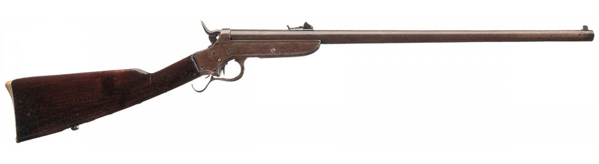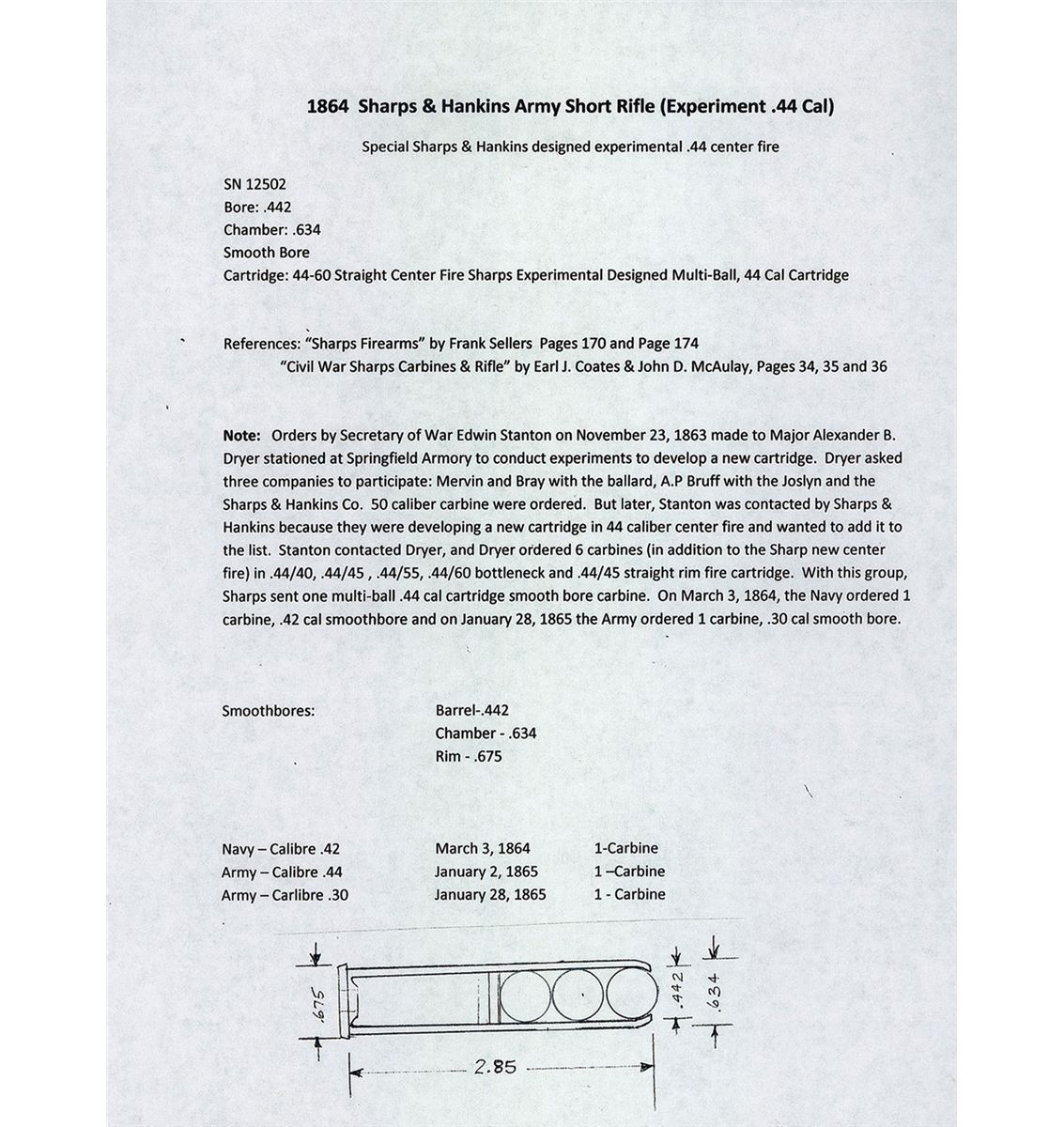 According to information supplied by the consignor, this arm was part of an experimental project run by the Springfield Armory for the development of a new cartridge, which included a Sharps & Hankins breechloader chambered for a 44 caliber centerfire multi-ball round, which fired a stack of 3 44 caliber balls at once. (This is supported on pages 170 and 174 of Sharps Firearms by Frank Sellers and Civil War Sharps Carbines & Rifle by Coates & McAulay on pages 34-36). Blade and adjustable notch sights, with "SHARPS/PATENT/1859" on the left side of the frame and "SHARPS/&/HANKINS/PHILADA" on the right. Smooth stock, with a single sling ring on the underside and a smooth brass buttplate.