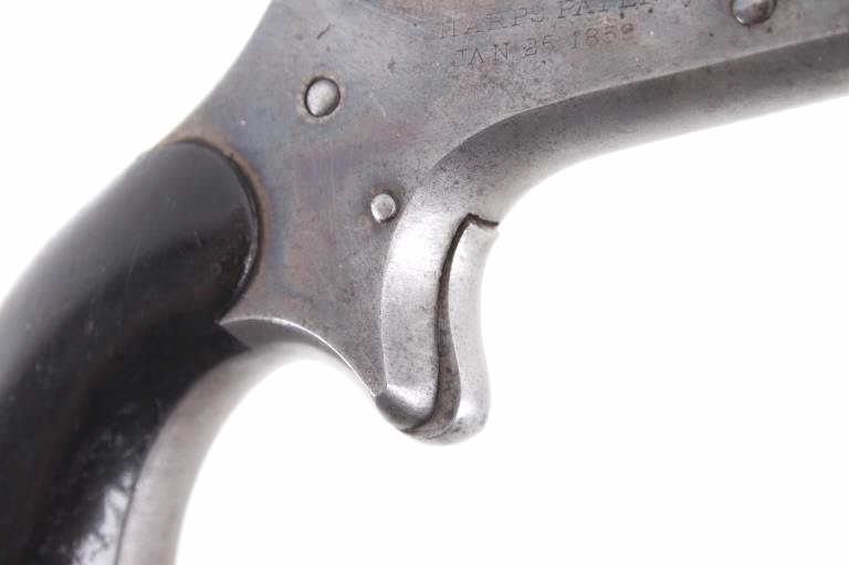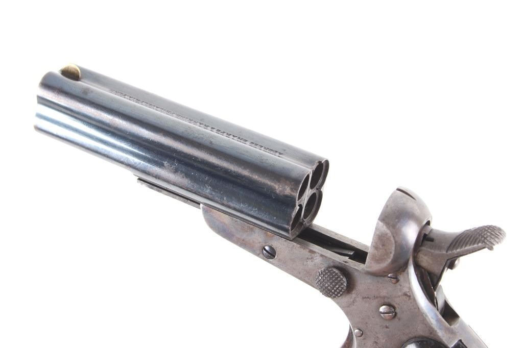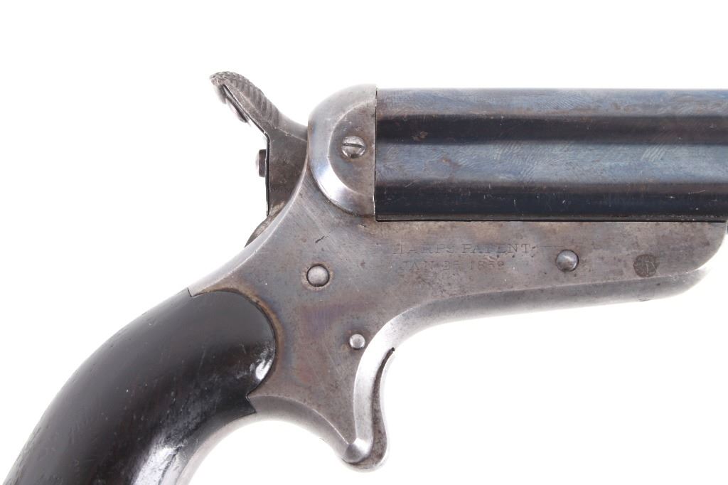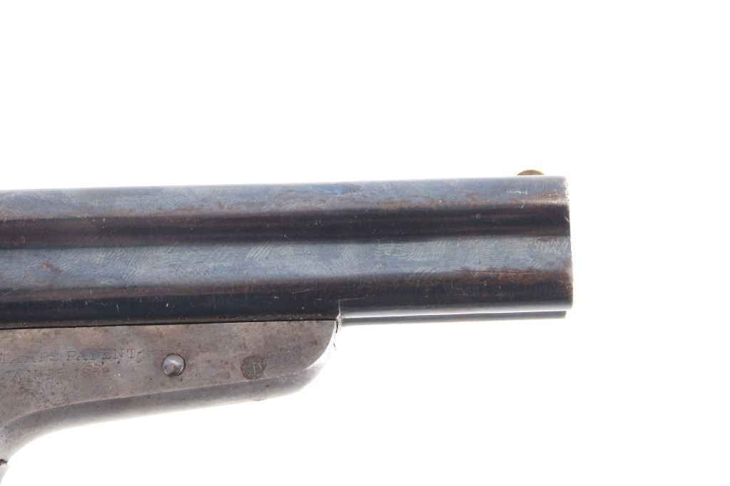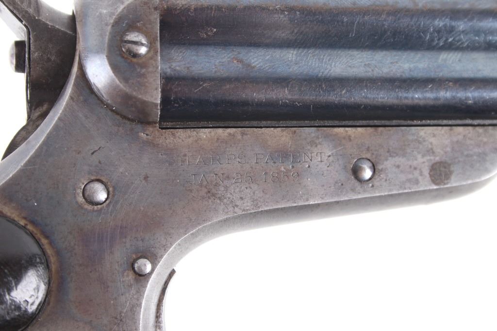 Featured in this lot we have a Sharps & Hankins model 3 four shot derringer pistol chambered in .32 caliber. This derringer displays 3 1/2" long 4 barrel block, hard wood grips, spur trigger, and rotating hammer pin. The pistol shows faint case hardening across the frame with a blue'd finish across the barrels. The top of the derringer is marked reading "ADDRESS SHARPS & HANKINS PHILADELPHIA. PENN." and the right side of the frame is marked "SHARPS PATENT JAN, 25, 1859". Mechanically the pistol shows a crisp trigger and working rotating hammer striker head. The pistol shows good condition overall with the barrel stop missing and some light wear due to age and use. The derringer weighs 12oz. Serial Number: 7751. This firearm qualifies as an Antique, and does not require FFL Transfer or NICS Background Check.