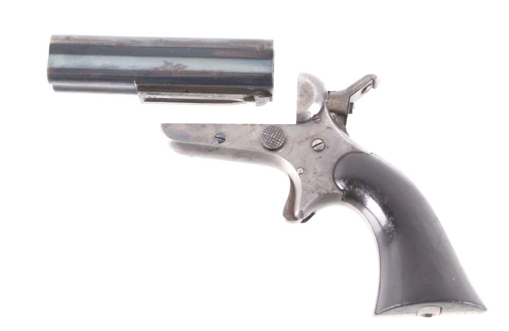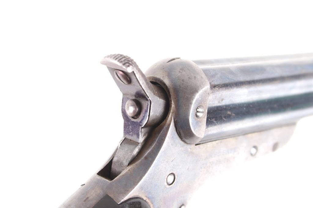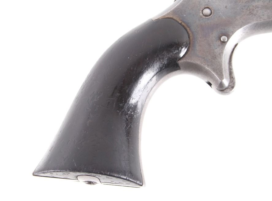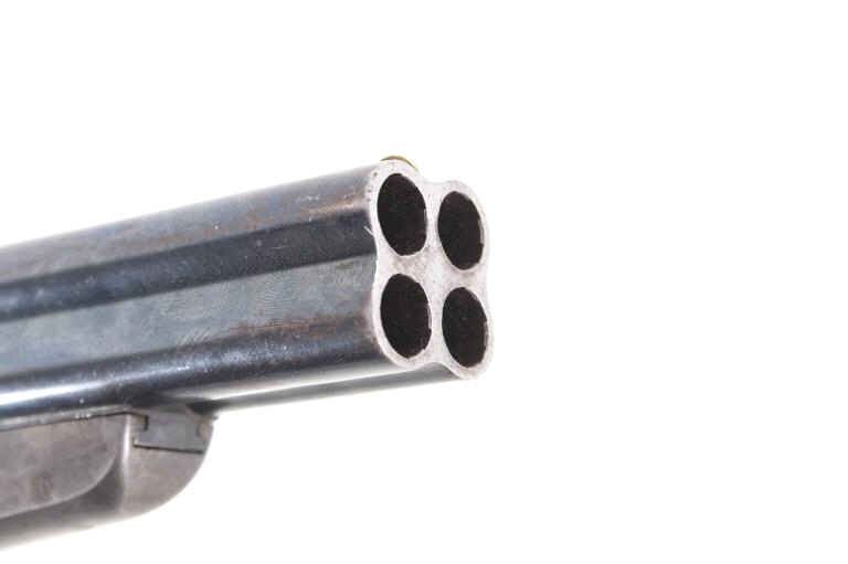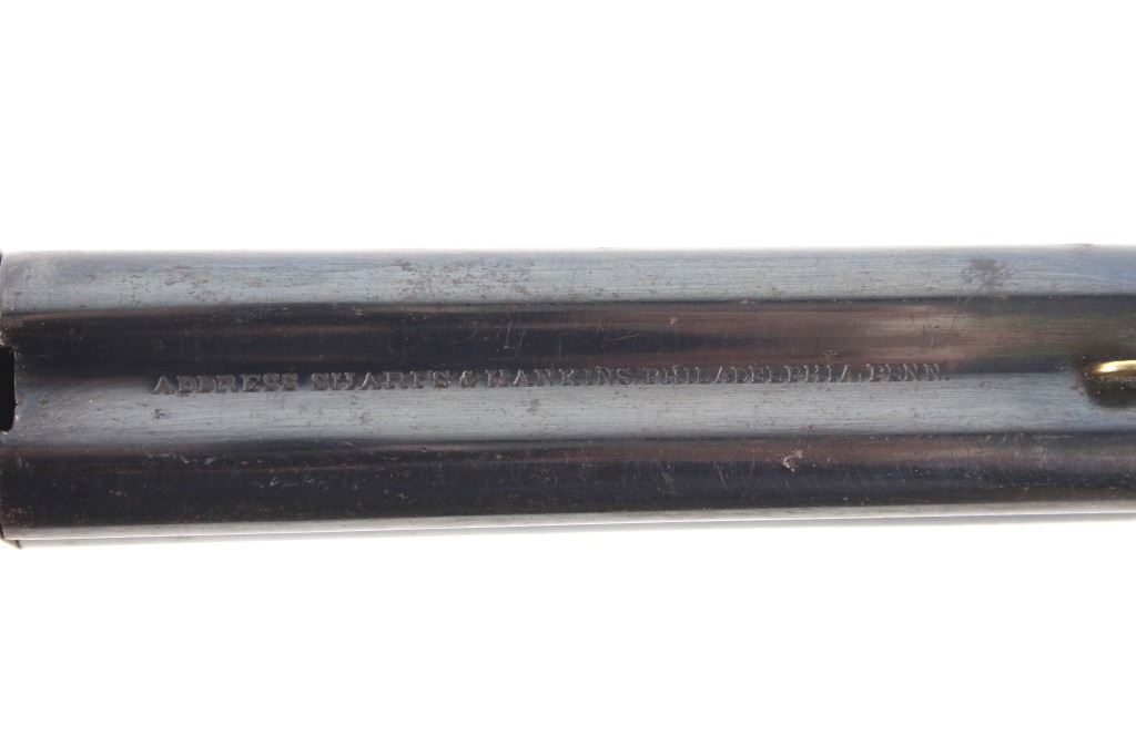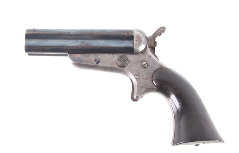 Featured in this lot we have a Sharps & Hankins model 3 four shot derringer pistol chambered in .32 caliber. This derringer displays 3 1/2" long 4 barrel block, hard wood grips, spur trigger, and rotating hammer pin. The pistol shows faint case hardening across the frame with a blue'd finish across the barrels. The top of the derringer is marked reading "ADDRESS SHARPS & HANKINS PHILADELPHIA. PENN." and the right side of the frame is marked "SHARPS PATENT JAN, 25, 1859". Mechanically the pistol shows a crisp trigger and working rotating hammer striker head. The pistol shows good condition overall with the barrel stop missing and some light wear due to age and use. The derringer weighs 12oz. Serial Number: 7751. This firearm qualifies as an Antique, and does not require FFL Transfer or NICS Background Check.