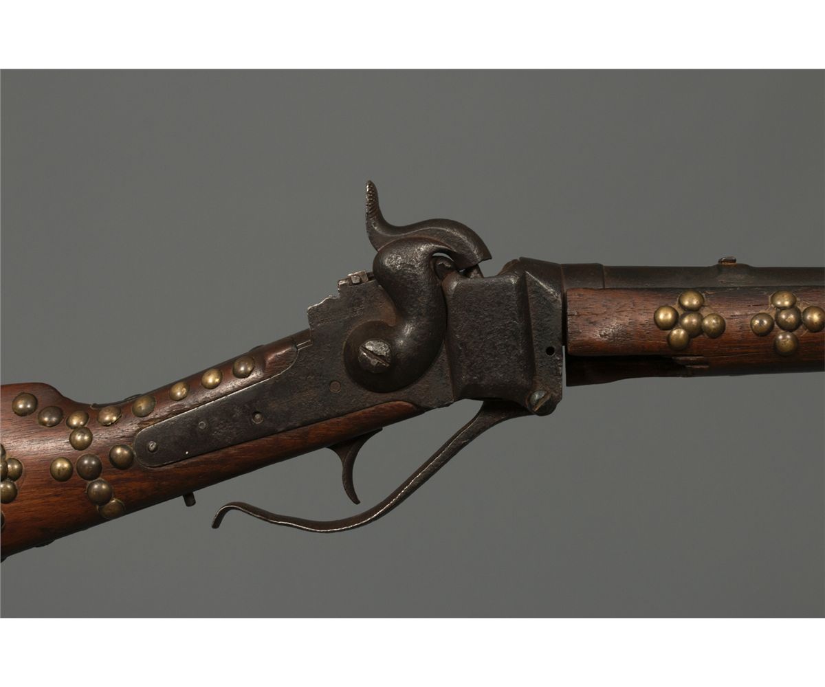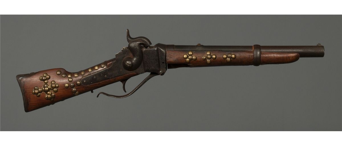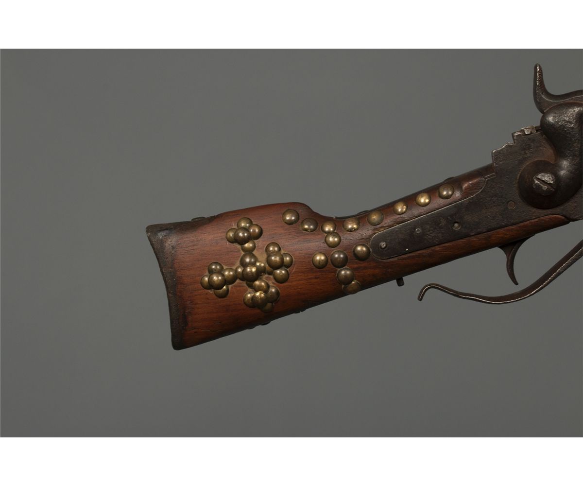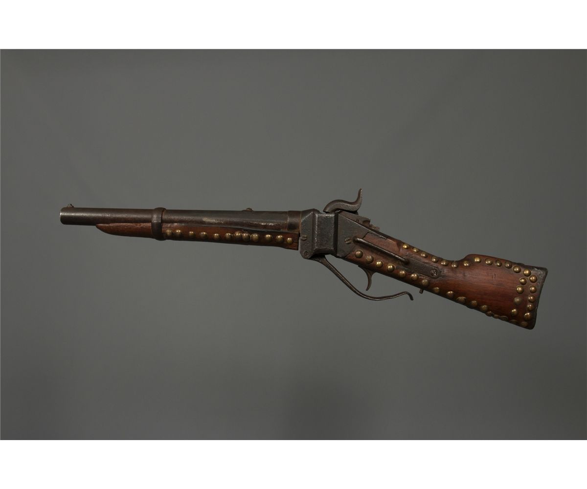 Sharps Indian Blanket Gun. Model 1859 Sharps with a cut-off 12" barrel. Covered in tacks. Serial 45513. Stock shortened.
