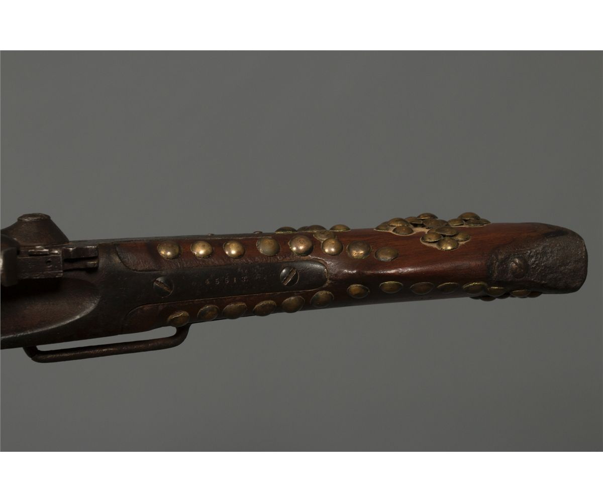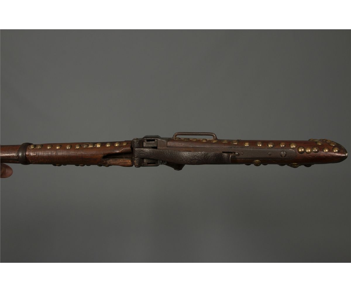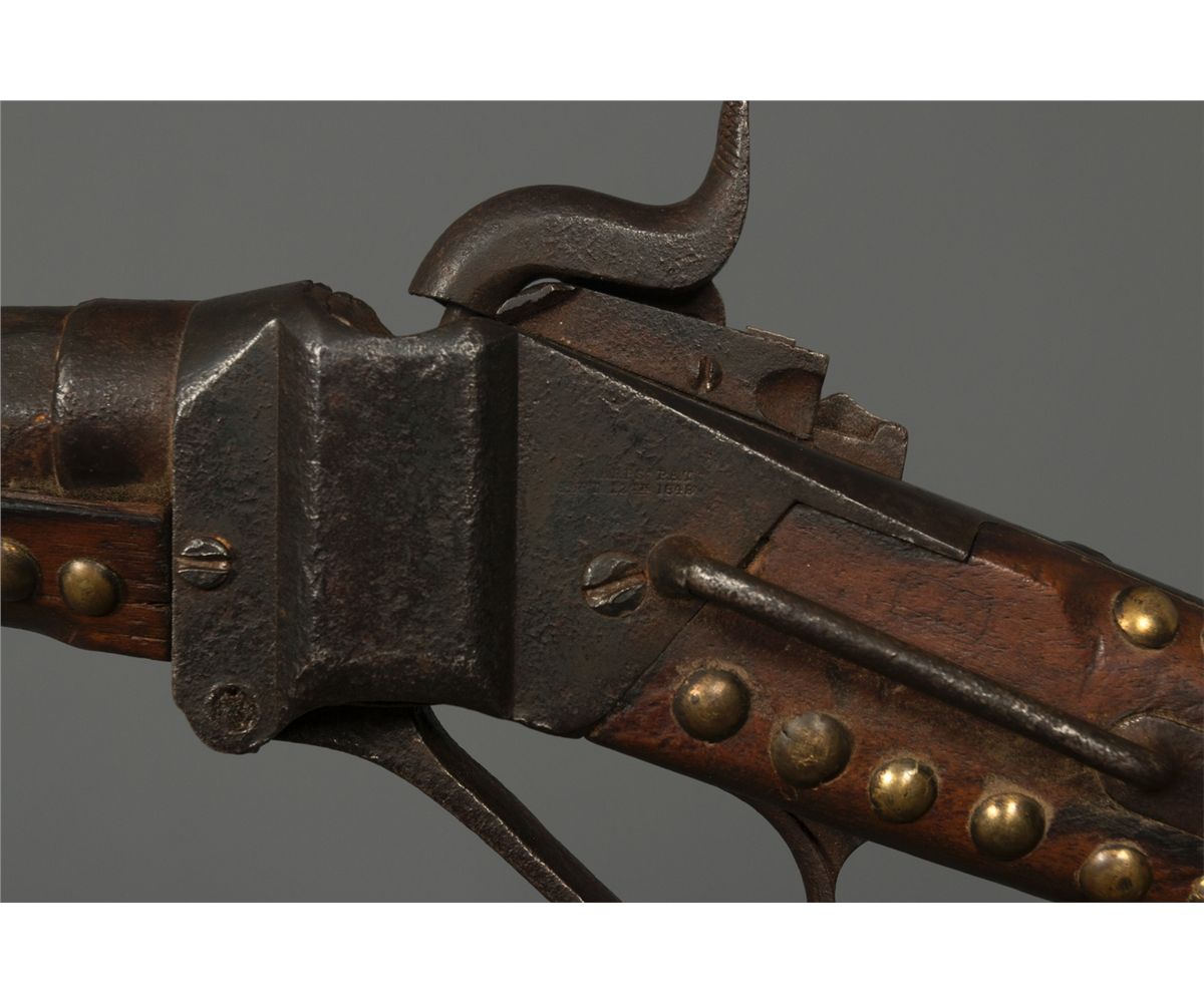 Sharps Indian Blanket Gun. Model 1859 Sharps with a cut-off 12" barrel. Covered in tacks. Serial 45513. Stock shortened.