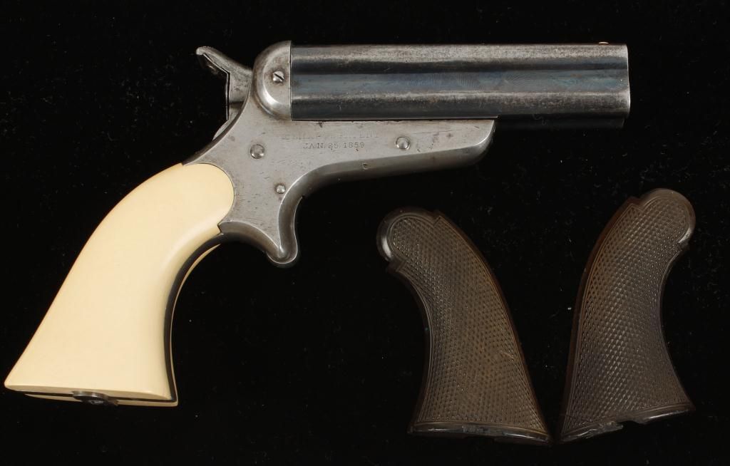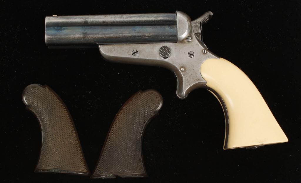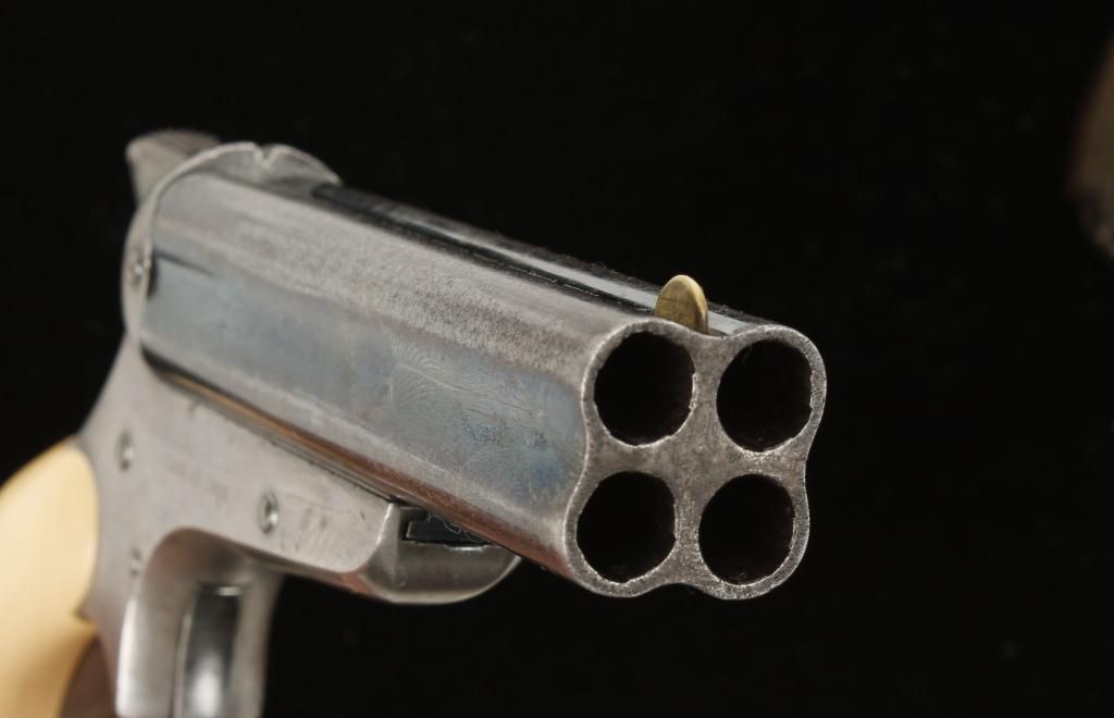 Early 4 barrel pepperbox made in Philadelphia, PA. Barrels are blued finish and 3-1/2", spur trigger, fixed sights and barrel slides forward for loading. Bores and action are in fine condition. Faux ivory grips with original grips included. Condition Fine with 50% bluing remaining on barrels. Action works very well.