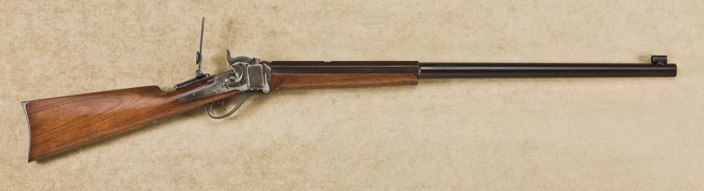 Sharps Meacham heavy barrel Sporting rifle, .50 cal., 30” half round/half octagon barrel, blue and case hardened finish, double set triggers, vernier tang sight, hooded front sight, very good plain wood stocks, top barrel flat stamped “J.P. Lower”, #C,46865 on the frame and #156056 on the underside of the barrel and #162042 crossed out under the barrel. The gun shows the majority of its blue finish on the heavy barrel, the receiver shows a couple faint traces of case color with the balance gone to a silvery color and brown patina with a couple of dents and mars to the left side of the receiver; the bore is bright, the markings very good, carbine butt stock with saddle ring base inlet into the left side of the butt stock; double set trigger needs adjustment. This interesting Meacham Sharps was previously in the Gaines de Graffenried collection. Also accompanying this lot is a handwritten letter from noted Sharps authority and owner of the original Sharps factory records, Dr. Richard Labowskie, indicating the receiver cannot be located in the records but that the barrel number was from a Sporting Rifle shipped to H. Folsom & Co., St. Louis on May 20, 1876, .44 cal., 30” octagon barrel, weighing 11 pounds. Further Dr. Labowskie states the crossed out number under the barrel is a blank in the records. A really neat frontier Sharps that certainly could tell quite a story. Est.: $3,000-$6,000.