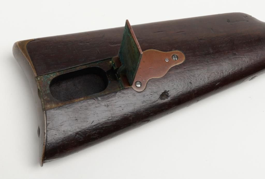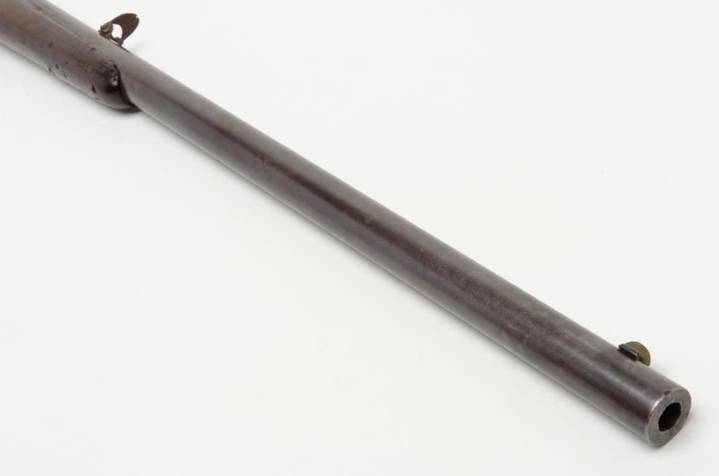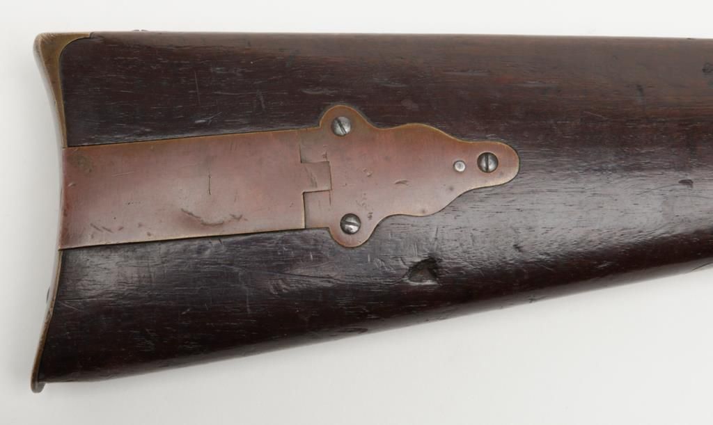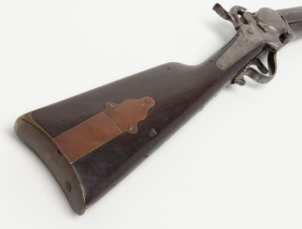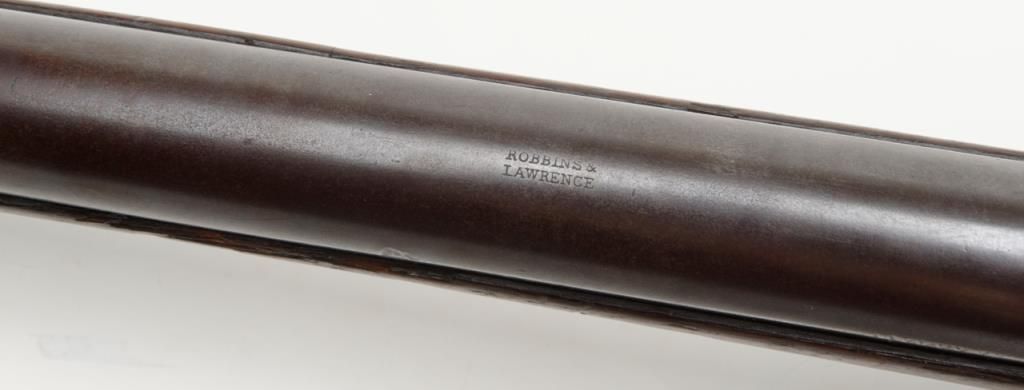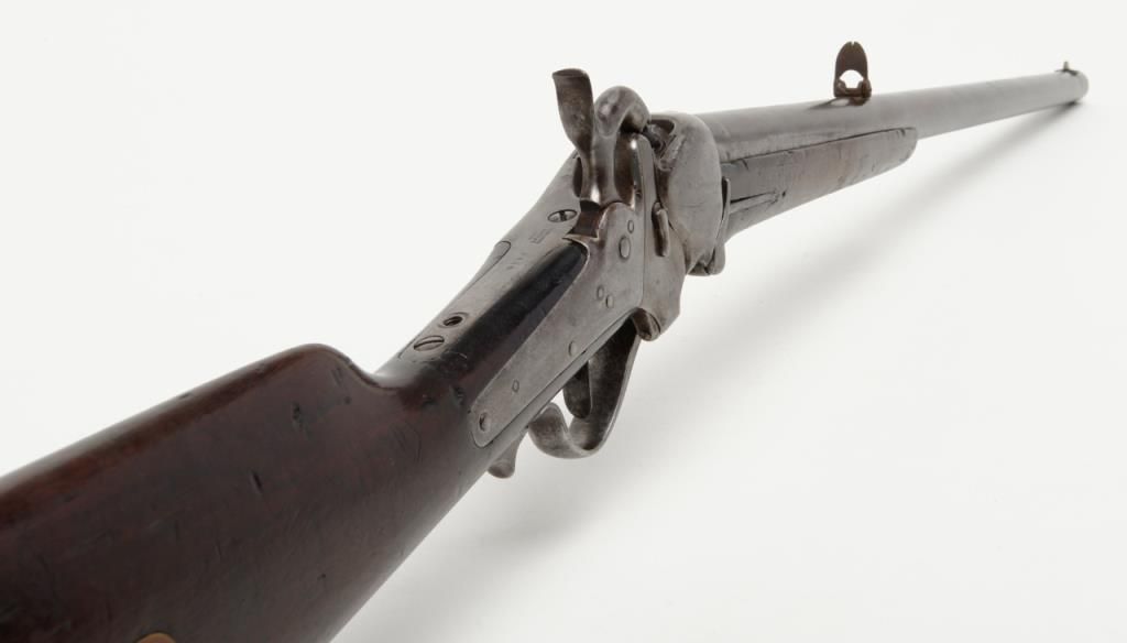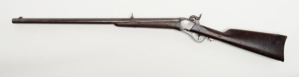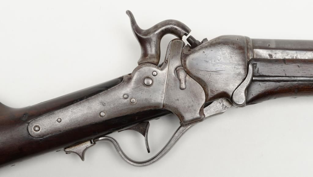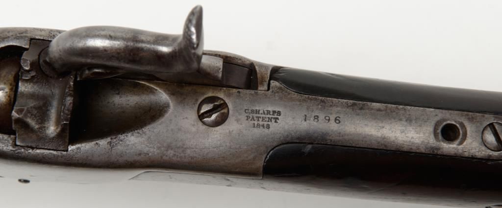 Sharps Model 1851 percussion Sporting rifle, .44 cal., 28” round barrel, brass mounts, 44” overall; one of only 400 produced making them one of the rarest of all Sharps production arms, refer Flayderman 5F-004. The gun remains in originalgood condition showing a gray to brown patina finish with some bright original brown on the barrel and with good clear Robbins and Lawrence stamp on the barrel; 1845 patent date visible on tape primer door, other markings very light andonly visible under magnification in this area. The tang is well-marked “C. Sharps patent 1848” with serial #1896. The stock is in good condition with some dings, mars, scratches, a couple of gouges and a small loss at the toe of the butt; otherwise sound overall with good un-cleaned patina on the brass. The original rear sight remains, the front sight is an old replacement in the correct dovetail. The tang is drilled for a sight which is not present. The action is good, the bore is good to very good with some erosion at the breech. A very significant early Sharps of the type pioneers carried West before the Civil War. (Antique). Est.: $4,000-$8,000.