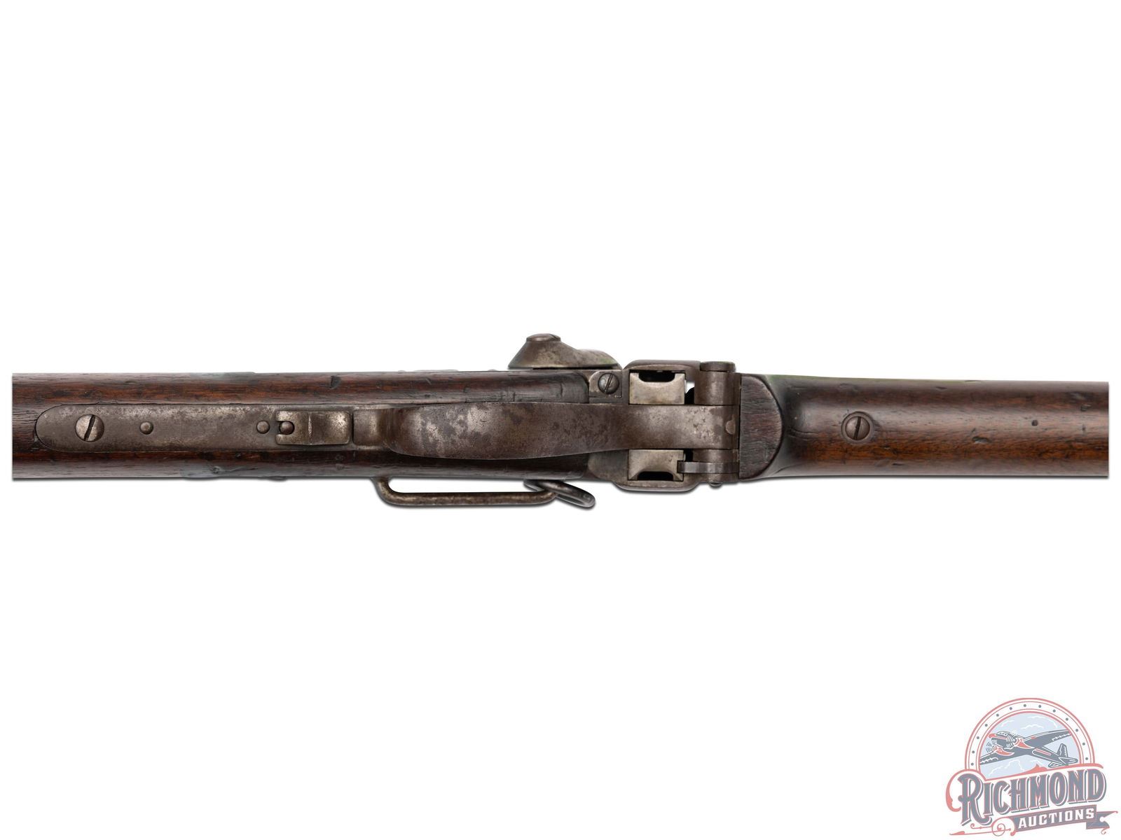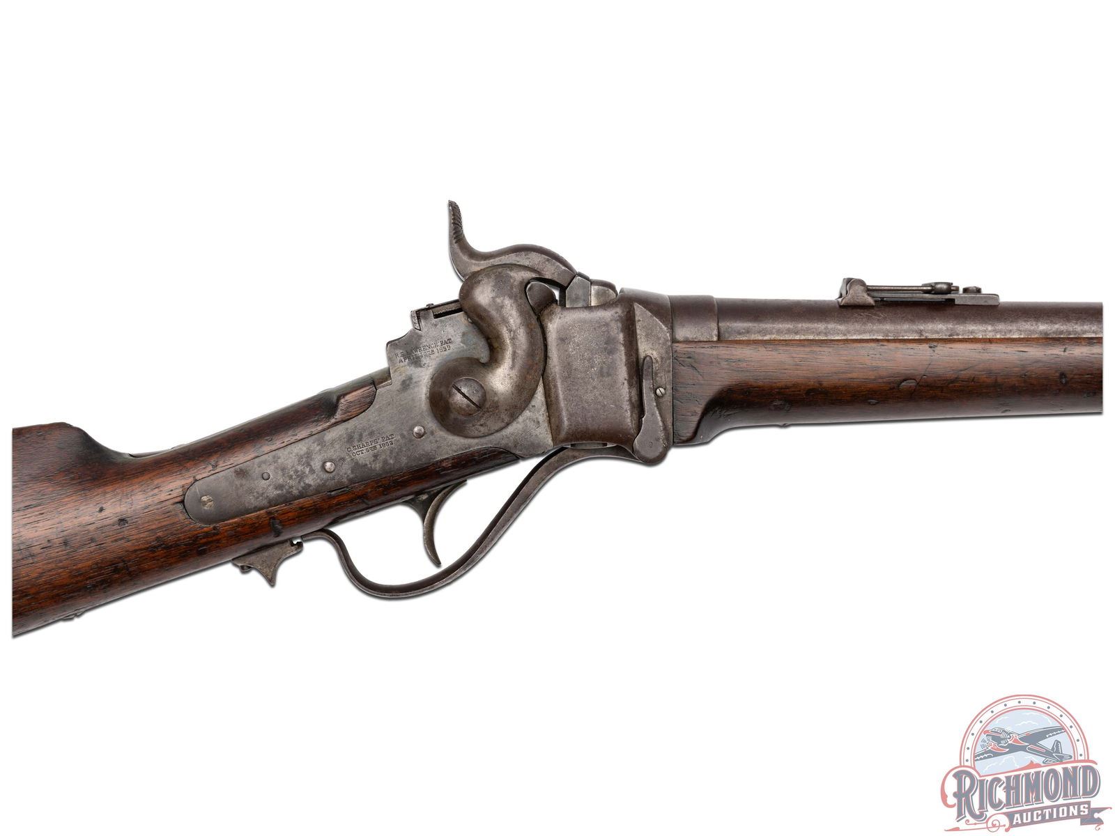 Made originally by Sharps Rifle Company of Hartford, Connecticut as a Percussion Carbine. These rifles were shipped to Sharps in 1867 and converted to 50-70 Centerfire. 22" blued round barrel with pinned blade front sight and R.S. Lawrence rear graduated flip sight. Barrel is marked with Sharps Hartford address and "New Model 1859" markings. Barrel retains original six groove rifling. Case-hardened saddle ring receiver, serial numbered "54301", with standard 1859 Patents and markings retaining percussion cap feeder. Frame has standard trigger with conversion 1867 spring loaded firing pin. Walnut standard conversion replacement stock with steel butt plate and remnants of "D.F.C." banner cartouche on left side center of butt stock. J.T. Livengood Collection. CALIBER: 50-70. S/N: 54301. FFL STATUS: Antique.