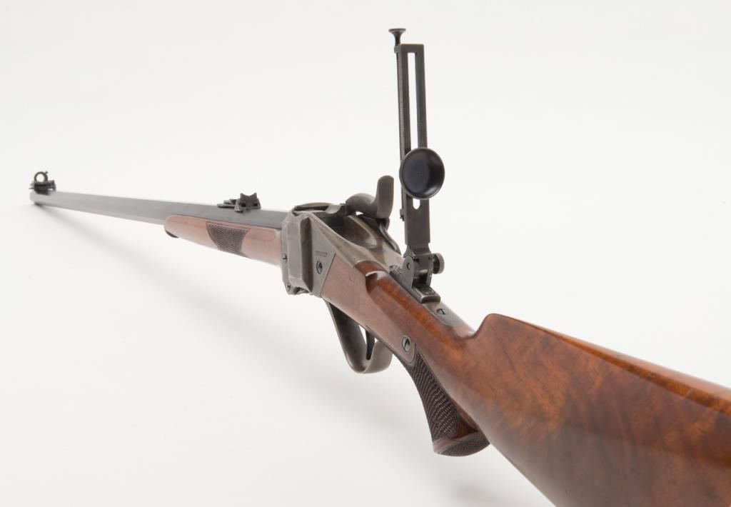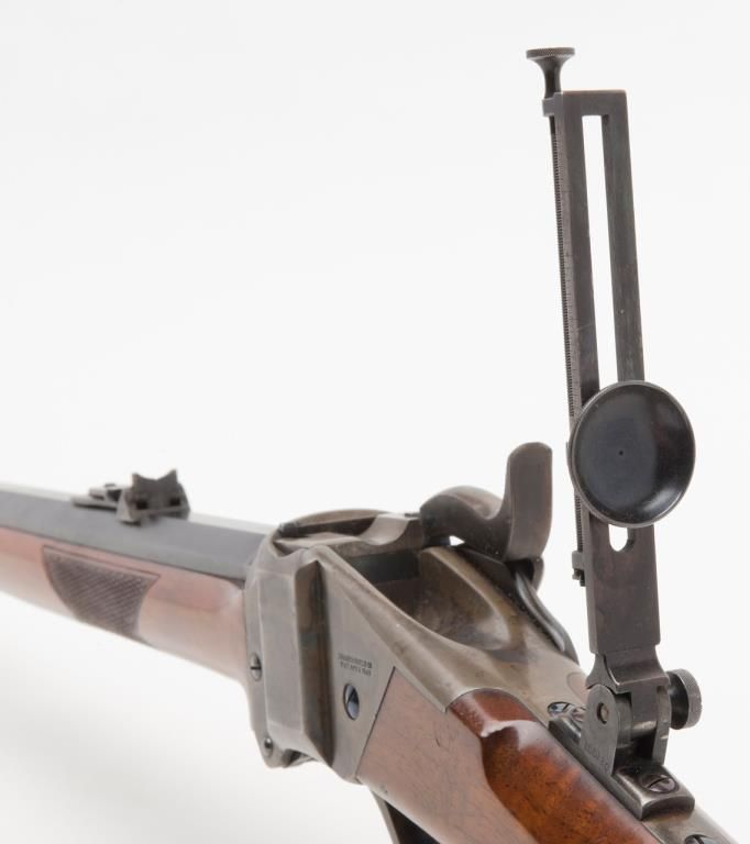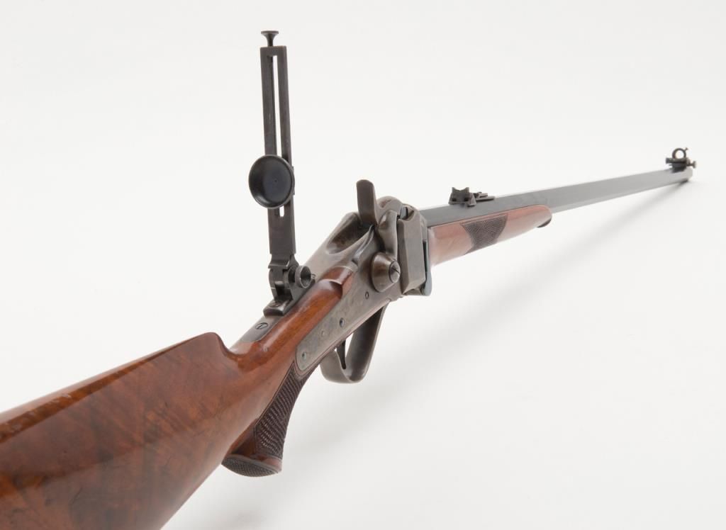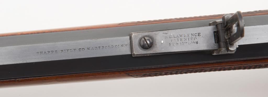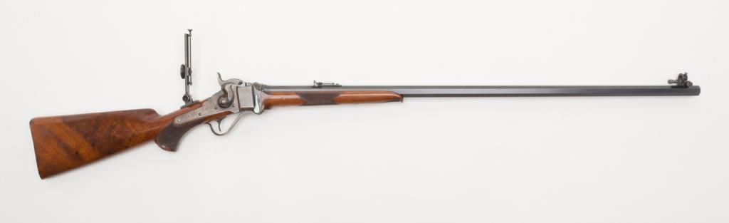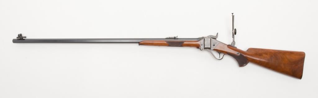 Sharps Model 1874 #1 Long Range Target single shot rifle, .44-90 cal., 34” octagon barrel, blue and case hardened finish, single trigger, checkered wood stocks with pistol grip and checkered steel butt plate, #155120 with copy of factory letterdated April 13, 1976 indicating rifle shipped on January 19, 1876 to Edward L. Baker of Red Wing, Minnesota and noting it as a Model 1874 Special Long Range rifle Number One, caliber 44 with a 34” octagon barrel, list price of $110; signed by the late Dr. R.L. Moore who also stated “The gun was shipped shortly before the move from Hartford to Bridgeport”. This rare rifle is in fine to excellent condition showing the majority of its original blue finish on the barrel as well as themajority of its beautiful original case colors on the receiver, loading lever and hammer. The bore is fine, the action crisp and the markings are sharp; the wood stocks show beautiful graining and are also in fine condition with some scatteredminor old mars and scratches from storage and a slight chip to the front of the edge of the pistol grip. The standard Lawrence flip-up rear ladder sight is present along with an adjustable Vernier tang sight and an adjustable hooded spirit level