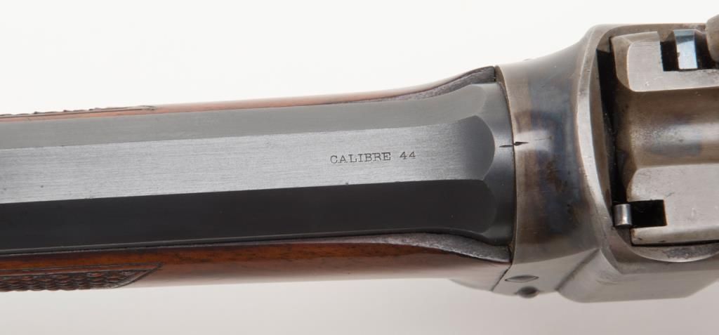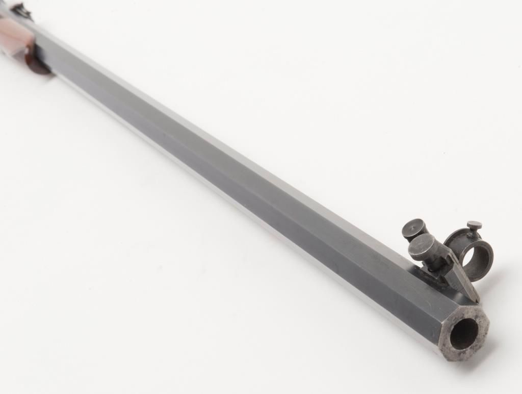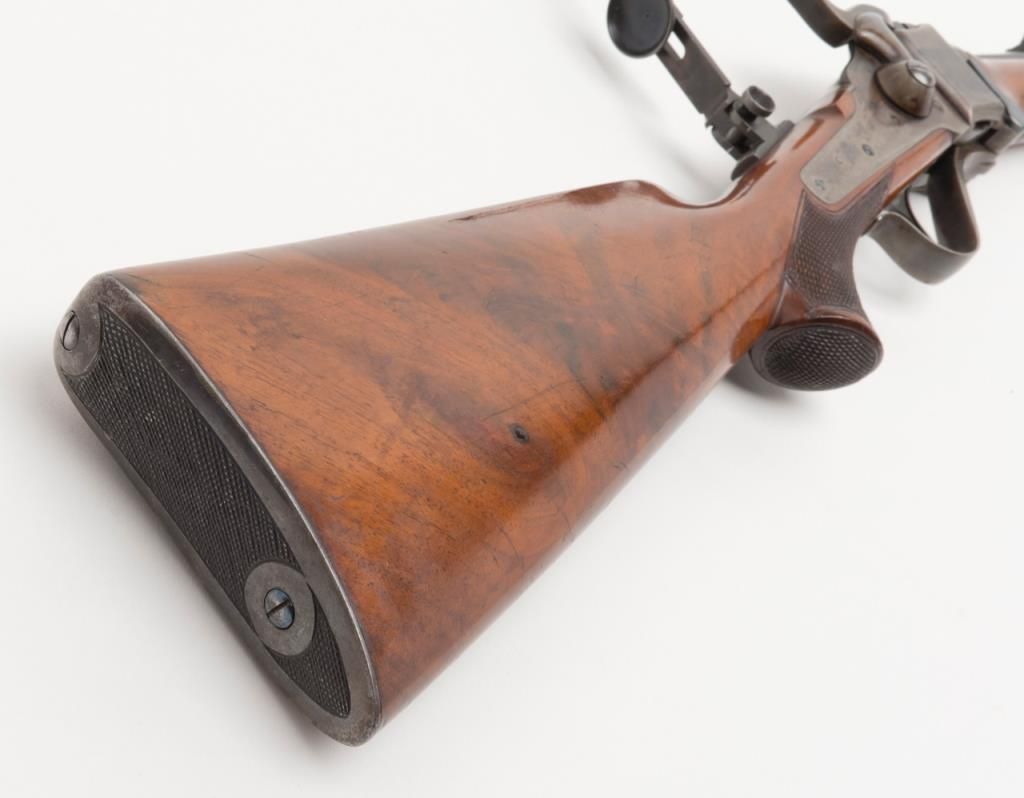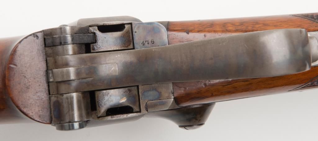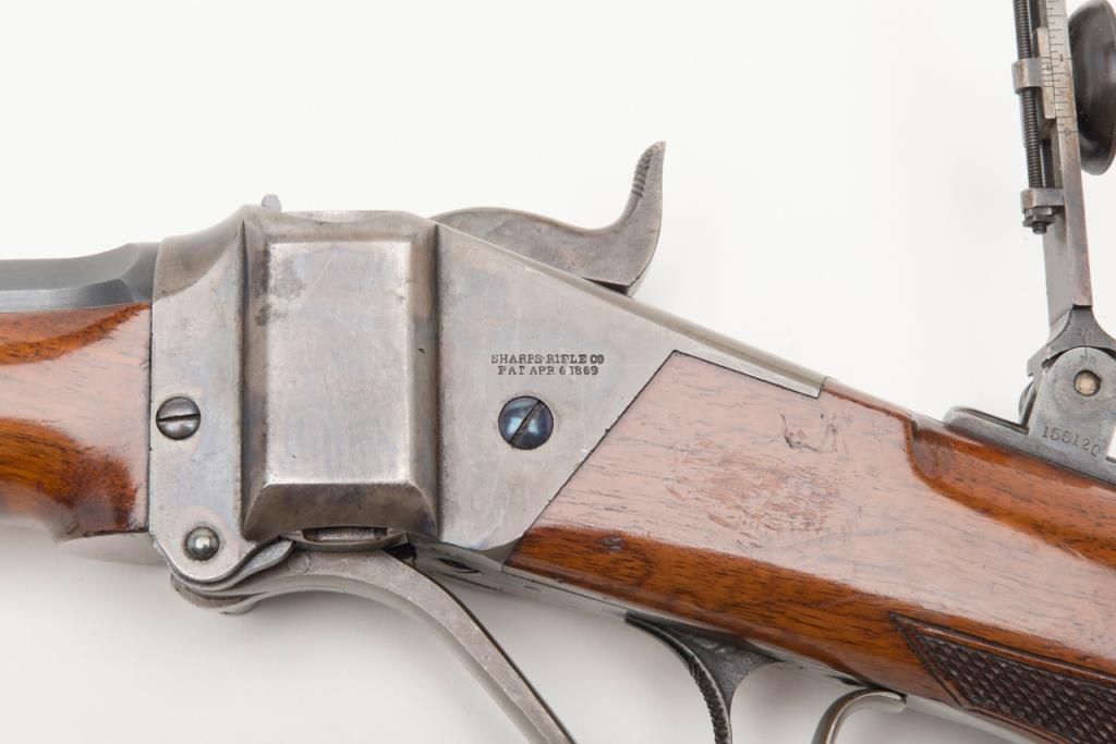 Sharps Model 1874 #1 Long Range Target single shot rifle, .44-90 cal., 34” octagon barrel, blue and case hardened finish, single trigger, checkered wood stocks with pistol grip and checkered steel butt plate, #155120 with copy of factory letterdated April 13, 1976 indicating rifle shipped on January 19, 1876 to Edward L. Baker of Red Wing, Minnesota and noting it as a Model 1874 Special Long Range rifle Number One, caliber 44 with a 34” octagon barrel, list price of $110; signed by the late Dr. R.L. Moore who also stated “The gun was shipped shortly before the move from Hartford to Bridgeport”. This rare rifle is in fine to excellent condition showing the majority of its original blue finish on the barrel as well as themajority of its beautiful original case colors on the receiver, loading lever and hammer. The bore is fine, the action crisp and the markings are sharp; the wood stocks show beautiful graining and are also in fine condition with some scatteredminor old mars and scratches from storage and a slight chip to the front of the edge of the pistol grip. The standard Lawrence flip-up rear ladder sight is present along with an adjustable Vernier tang sight and an adjustable hooded spirit level