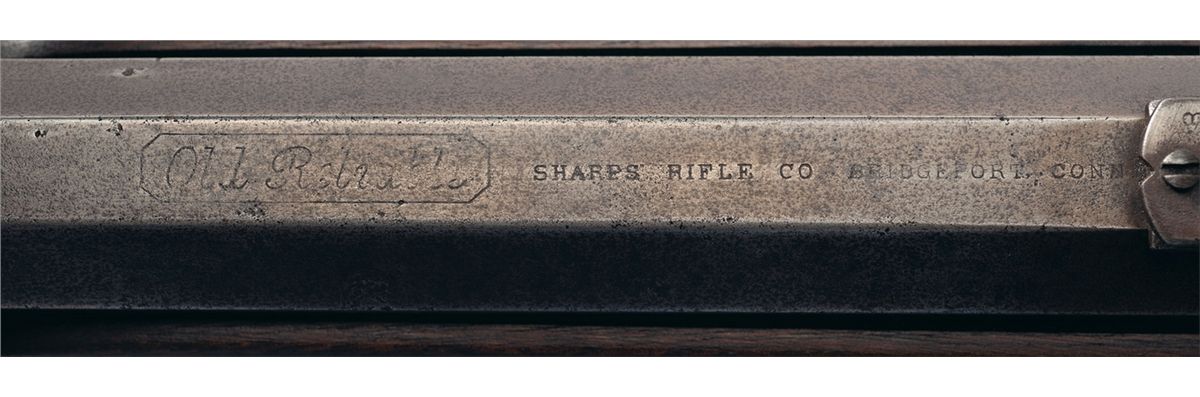 Dovetailed German silver blade front sight and flip up rear sight. The top flat of the barrel is marked in script "Old Reliable" in a rectangle with flattened corners, "SHARPS RIFLE CO. BRIDGEPORT, CONN." in one line and "CALIBRE 45". The left flat of the barrel is marked "2 1/10" with the right barrel flat marked "L +". The serial number is stamped on the upper tang, the left side of the receiver is stamped with an illegible marking and the right side is stamped "C. SHARPS' PAT/OCT 5th 1852.". The bottom of the barrel has been renumbered to the receiver which has double set triggers. Mounted on a smooth walnut forearm with Schnabel tip and straight grip stock with patch box, a brass inlaid oval stamped "3" near the toe and a smooth curved steel buttplate.