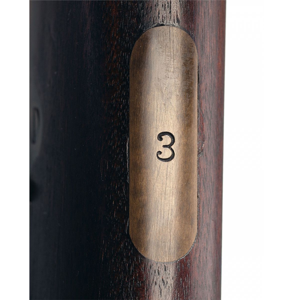 Condition: Refinished and assembled, the barrel has an artificial brown patina with some scattered pitting and a silver patina on the high edges. The front sight is a replacement and the rear sight is missing the elevation adjustable slide. The lever retains most of the muted case colors with the remainder of the casehardened parts having a gray/brown patina with some minor pitting. A few of the screws, the lever and lever hinge pin are replacements. The action needs work. The earlier production replacement wood is very good with some scattered moderate dings.