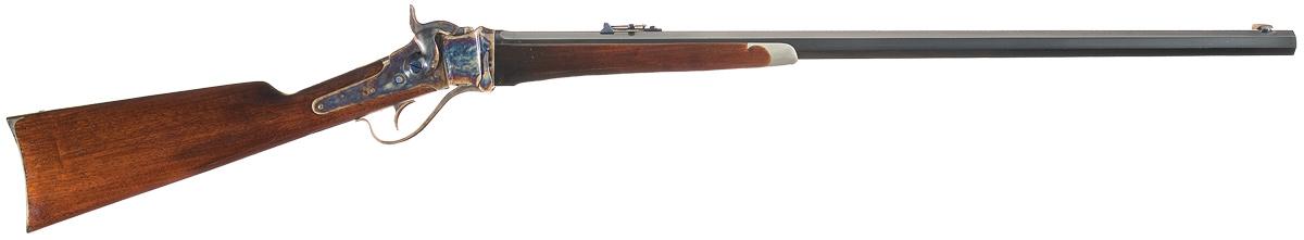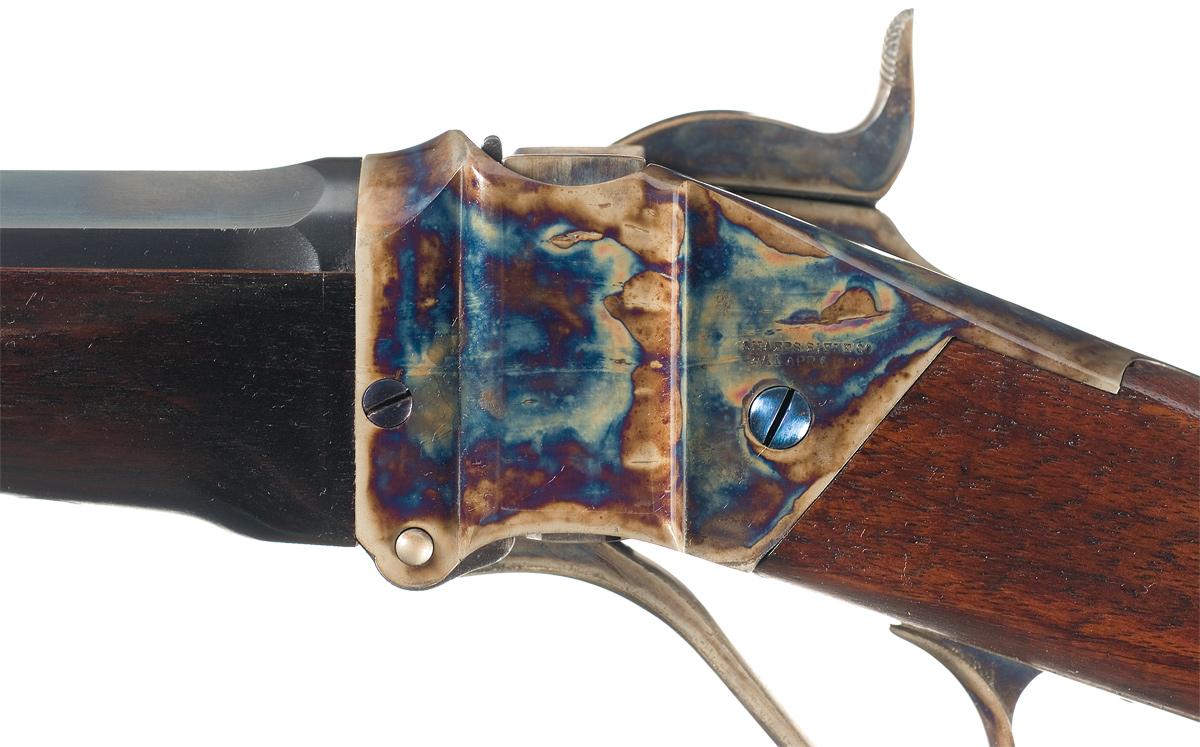 This is an excellent example of a professionally restored Sharps Model 1874 Sporting Rifle. The top barrel flat is marked "Old Reliable" in a box and "SHARPS RIFLE CO. BRIDGEPORT. CONN." ahead of the rear sight and "CAL. 45" at the breech and "2 7/8" on the right flat near the breech. The left side of the receiver is marked "SHARPS RIFLE CO / PAT APR 6 1869", the lock is unmarked and the serial number is marked on the top strap. Brass blade front and ladder style rear sight, single trigger, blue barrel and casehardened remaining parts, and mounted with s smooth forearm and straight grip stock with a silver forend .