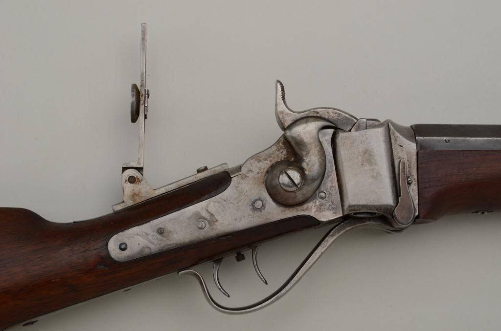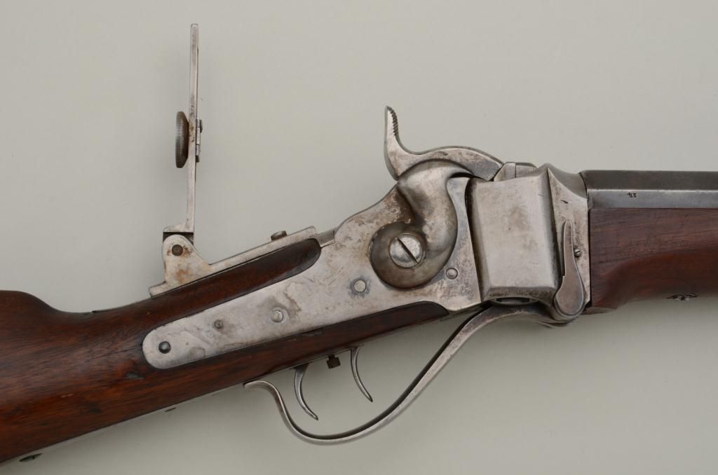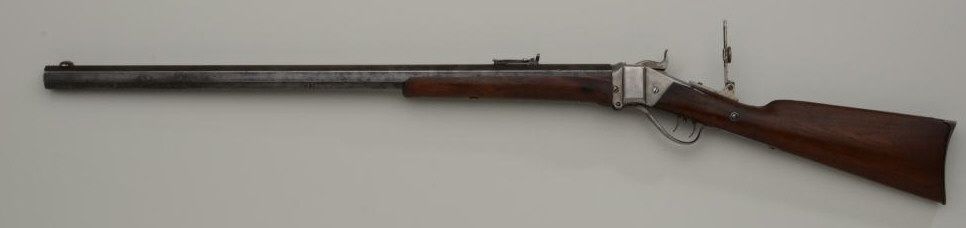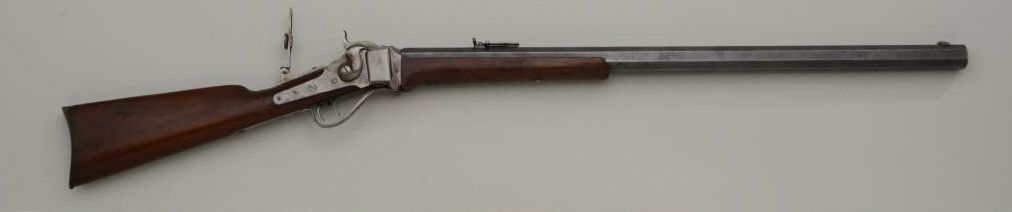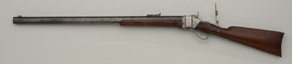 Sharps Model 1874 Sporting rifle, .45 caliber, 2-7/8” cartridge, 30” heavy octagon Sharps “Old Reliable” Bridgeport address barrel, blue finish, double set triggers, wood stocks, Walter Cooper style front andrear sights, adjustable Vernier tang sight, #158912. This gun is in overall good condition showing traces of blue on barrel with scattered old nicks and mars from carry and use, silvery tone on receiver, goodaction with double set triggers working at time of description, somewhat rough bore, underside of barrel shows no serial number but does display the number 10, a separate number 1 and the initials “WC”; the buttstock is overall good, the forestock appears to be an old replacement, possibly at time of barrel addition and is good with an old repair to the rear left edge. Accompanying this lot is a copy of the Sharps CollectorReport of Spring 1999 containing an extensive article on Walter Cooper; also a note from the consignor that reports this rifle was shipped on October 6, 1876 as a .45 caliber business rifle to Kittredge & Co. of