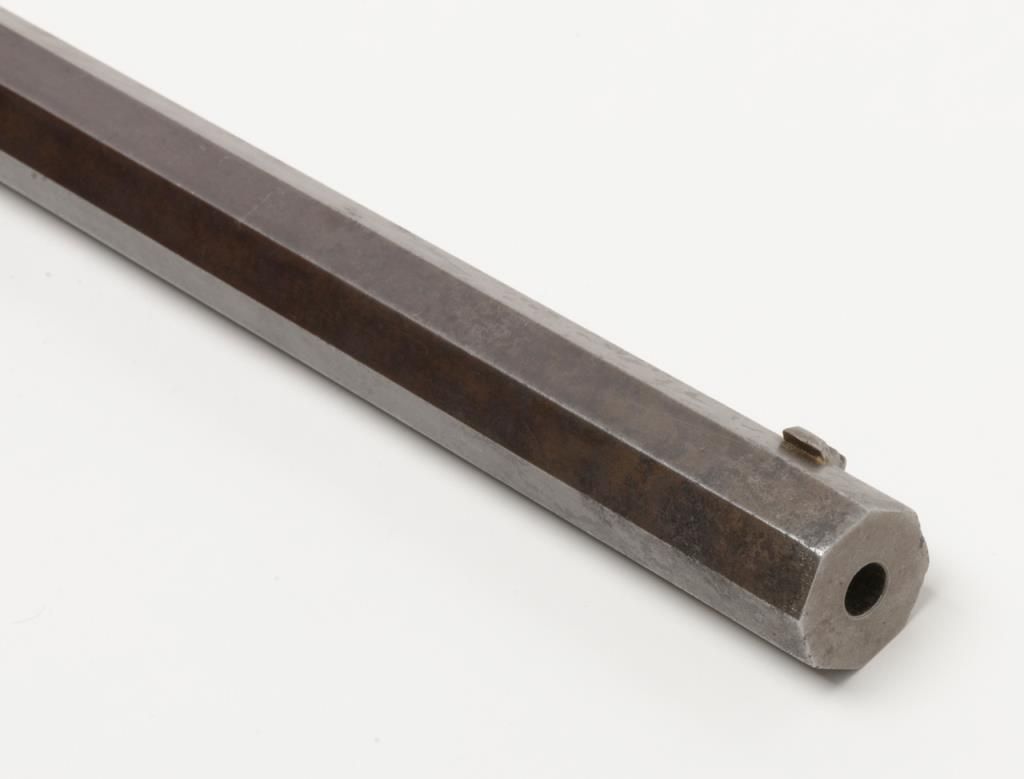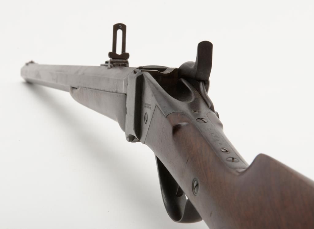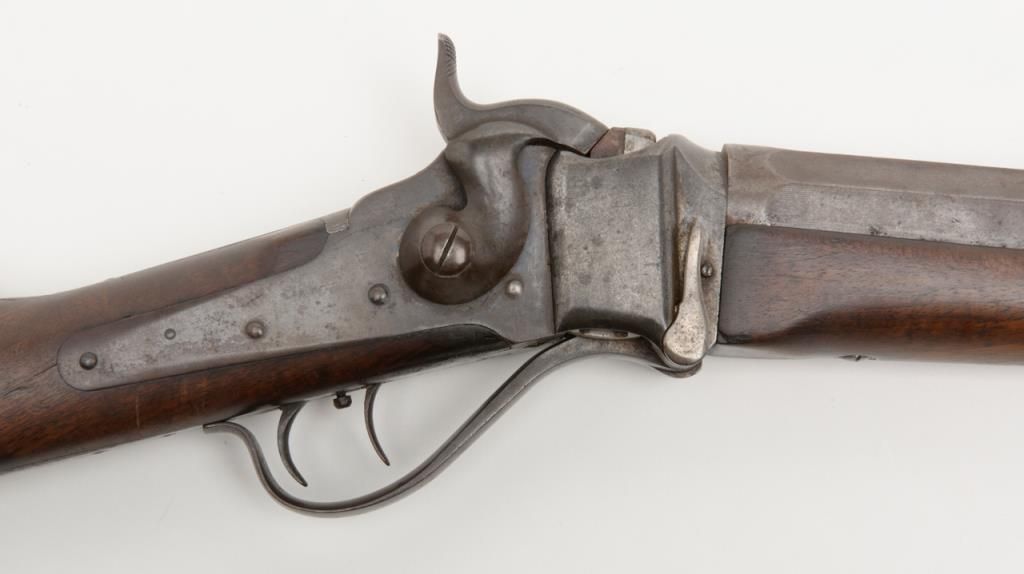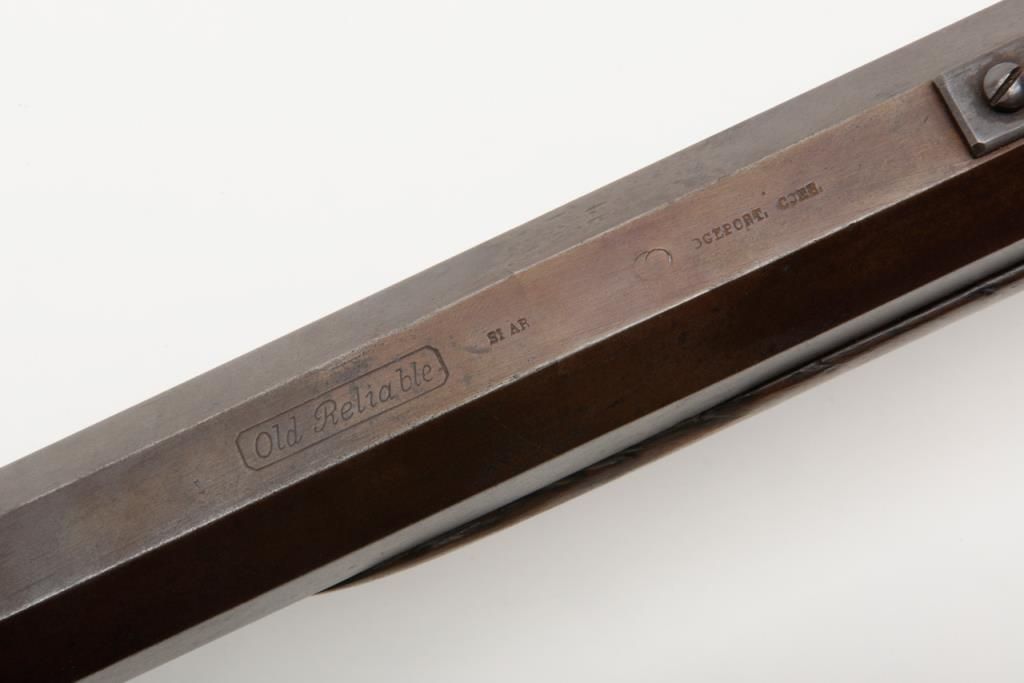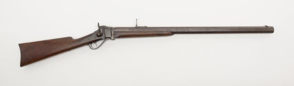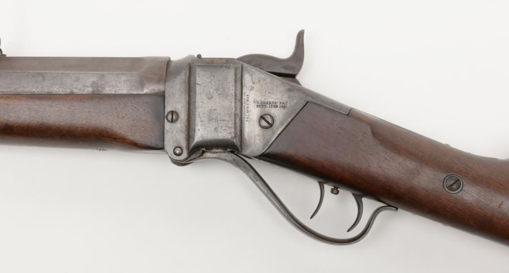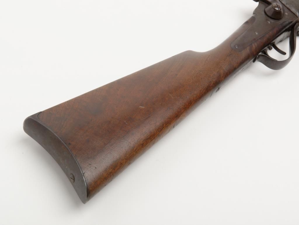 Sharps Model 1874 rifle, serial number C54001 originally invoiced May 6th, 1875 to Capt. John Mix of the U.S. Army stationed at Fort Laramie, Wyoming. Originally shipped as sporting rifle in .44 caliber with 30” barrel, double set triggers,open sights and oil finished stocks. The rifle shows a period frontier conversion to extra heavy Davenport barrel and re-calibered to .40 with 2 5/8” case, (40-90). The barrel shows W.C.D. markings and Eagle underneath along with “OldReliable” and “Bridgeport” stamp on top flat along with stamped caliber markings at the breech. The original factory letter to Mr. Bill Gary is included along with a subsequent letter by custodian of Sharps records Dr. Robert L. Moorewho is a noted Sharps historian and expert in which he states that “These Davenport barrels were made after The Sharps Company failed and used by Walter Cooper along with other frontier gunsmiths”. Also Dr. Moore’s letter confirms theidentity and placement of the markings. This rifle weighs slightly under 16 pounds total and shows a gray to brown patina finish with some slight traces of case hardening in the grayish color on the action. The wood stocks are good with slight
