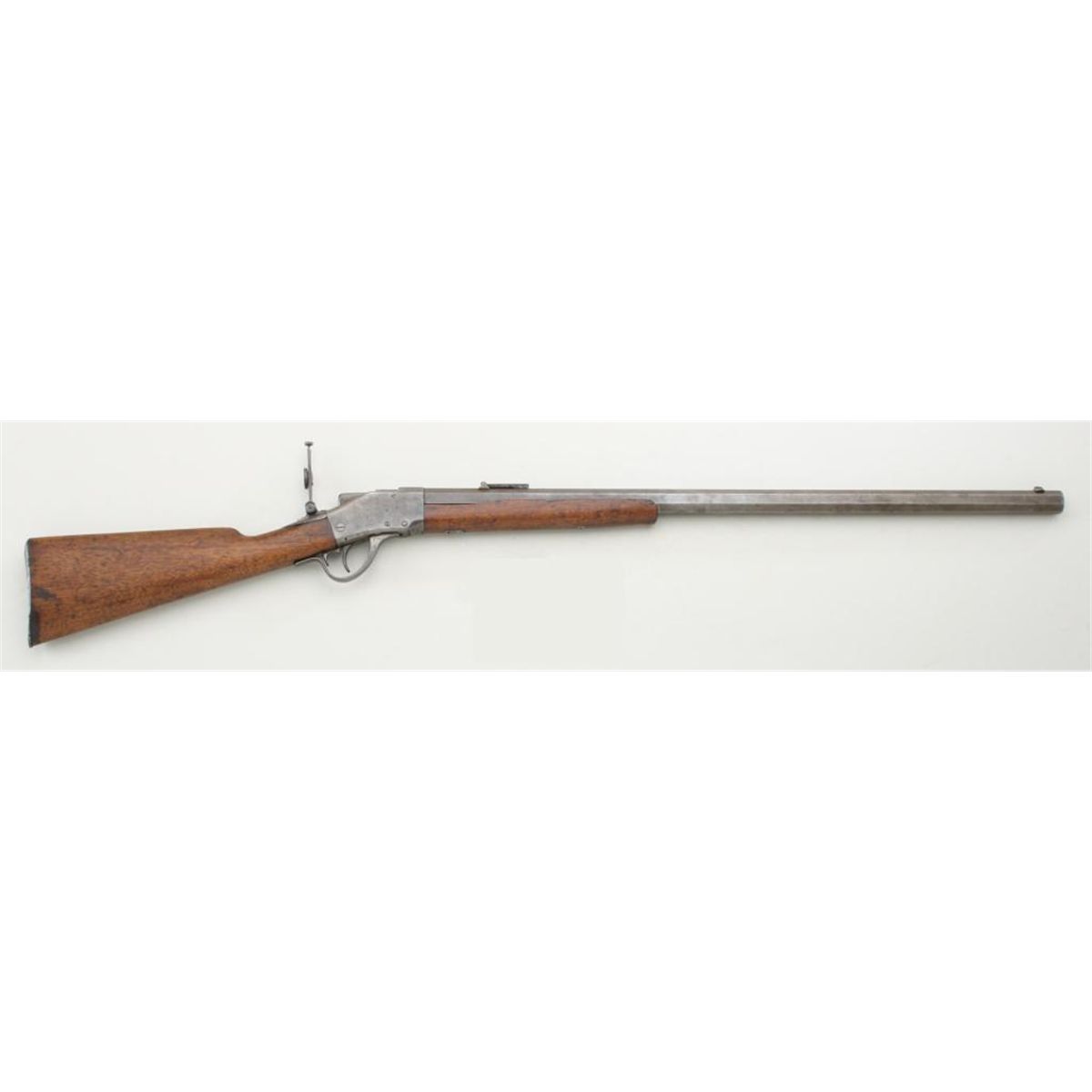 Sharps Model 1878 Borchardt single shot Sporting rifle, .45 2-1/10” cal., 30” heavy octagon barrel, “J.P. Lower, Denver, Col” marked barrel, grey patina, wood stocks, checkered shotgun butt plate, vernier tangsight, Lawrence ladder rear sight and blade front sight, #17571. This gun is in overall very good condition showing an even grey patina on metal surfaces, overall very good bore, crisp action, very good markings, woodfore stock is fair with wear and old losses on each side at top edges; butt stock is overall good showing wear and scattered mars and scratches from carry and storage. A classic looking Borchardt with famous Western maker’s marks and period extended base to top of receiver, likely done by Lower, to support the vernier tang sight. Est.: $2,500-$3,500.